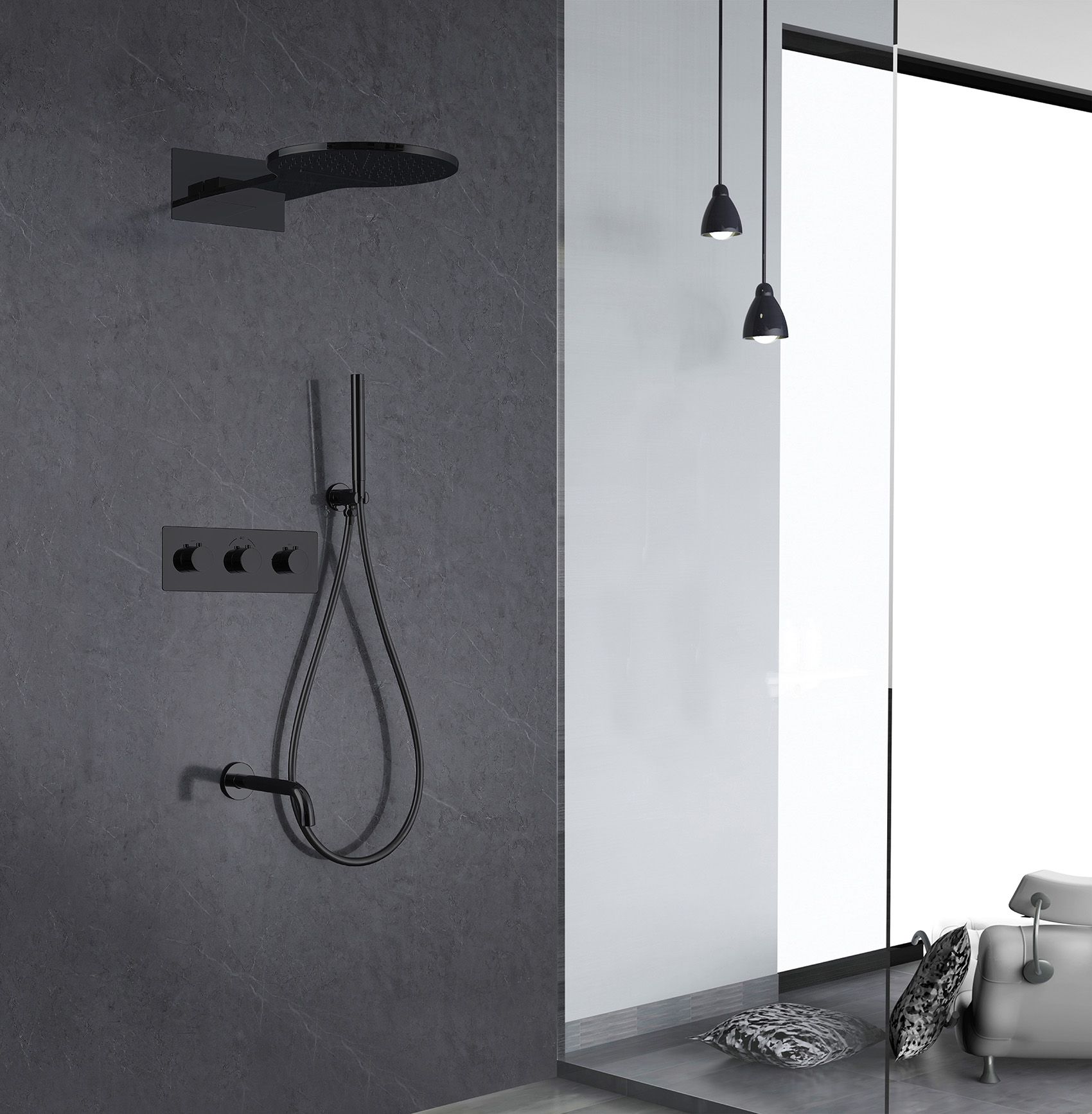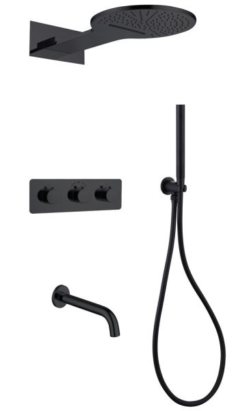 Душевой комплект ABBER роскошно дополнит вашу ванную комнату своим незаменимым функционалом. Душевые комплекты ABBER включают в себя все необходимое для создания идеального душевого пространства. Душевой комплект ABBER производится из высококачественных материалов, с отсутствием вредных примесей. Душевой комплект ABBER правильное решение в оснащении ванной комнаты.Душевая система скрытого монтажа с изливом, термостат, черная матовая