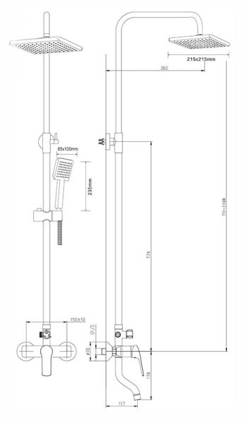 Душевая система (смеситель с изливом) в цвете глянцевый хром: верхний душ (215х215 мм) создаёт эффект тропического дождя, что дарит непередаваемые эмоции во время ежедневных банных процедур. Ручной душ 95х100 мм (1 режим) на гибком полутораметровом шланге (в металлической оплетке) с защитой от перекручивания. Держатели верхнего и ручного душа с регулировкой угла наклона, телескопическая штанга 800-1200 мм. Смеситель однорычажный (керамический картридж) с поворотным изливом (117 мм). Подвижные детали отличаются долговечностью. Аэратор, форсунки верхнего и ручного душа с функцией легкого очищения от известкового налета.