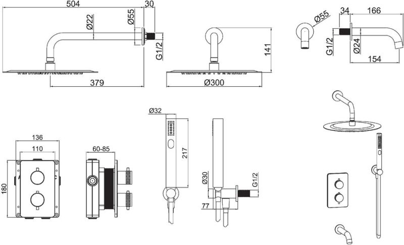 Верхний душ: 30х30 см.