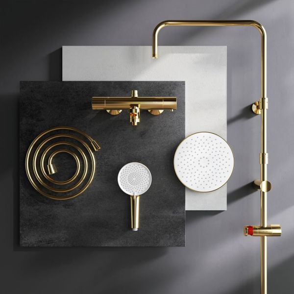 Настоящее произведение ювелирного искусства в вашей ванной комнате: нежный оттенок розового золота получается методом вакуумного напыления смеси 24-каратного золота, серебра и меди, в процессе которого микрочастицы сплава образуют стойкое соединений с латунной основой. Прочность эксклюзивного покрытия Everlast Gold сравнима с прочностью сапфира.Благодаря специально спроектированной эргономичной ручке вы можете управлять душевой системой даже с мыльными руками. Термостатический картридж с высокочувствительным термоэлементом и быстрой реакцией на изменения температуры или давления надежно защищает от ожога даже при внезапном отключении холодной воды.Телескопическая штанга с диапазоном регулировки 400 мм сделает процесс принятия душа удобным для людей любого роста. А благодаря увеличенным размерам тропического (220 мм) и ручного (120 мм) душей вы ощутите все преимущества использования дизайнерского продукта.Душевая система X-Joy была создана для того, чтобы радовать вас каждый день.