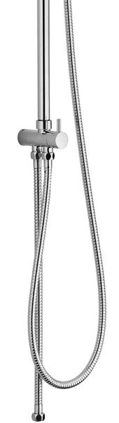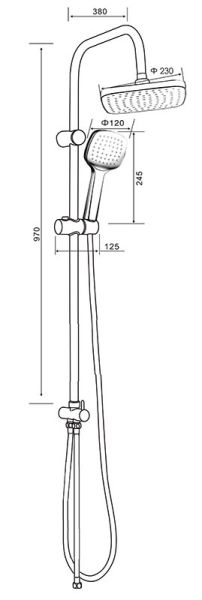 Душевая система создаёт эффект тропического дождя, что дарит непередаваемые эмоции во время ежедневных банных процедур. Конструкция обеспечивает стабильный и интенсивный напор. Подвижные детали отличаются долговечностью. Фиксируется душевая система непосредственно на стене, что позволяет рационально использовать ограниченное пространство ванной комнаты. Верхний душ 230х230 мм (с силиконовыми наконечниками для просто удаления известкового налёта и регулировкой угла наклона), ручной душ 120х120 мм (1 режим), регулируемый по высоте и наклону держатель ручного душа, шланг 1,5 м (в металлической оплетке) с защитой от перекручивания, штанга 970 мм. с подвижным держателем (возможность установки в старые отверстия). Цвет глянцевый хром.