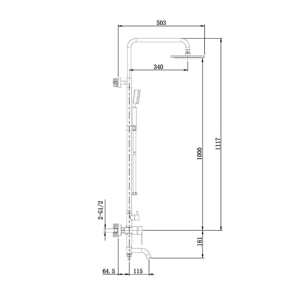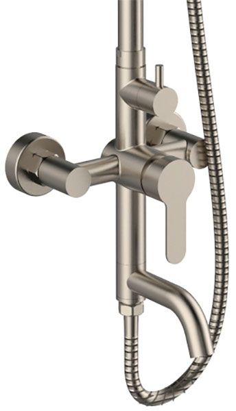 Душевая система в комплекте: однозахватный смеситель для ванны с керамическим картриджем и изливом (115 мм); верхний душ d 200 мм (с силиконовыми наконечниками для просто удаления известкового налёта и регулировкой угла наклона), ручной душ (1 режим), регулируемый по высоте и наклону держатель ручного душа, шланг 1,5 м (в металлической оплетке) с защитой от перекручивания, штанга 1117 мм. Переключение на душ осуществляется с помощью поворота излива. Цвет матовый никель.