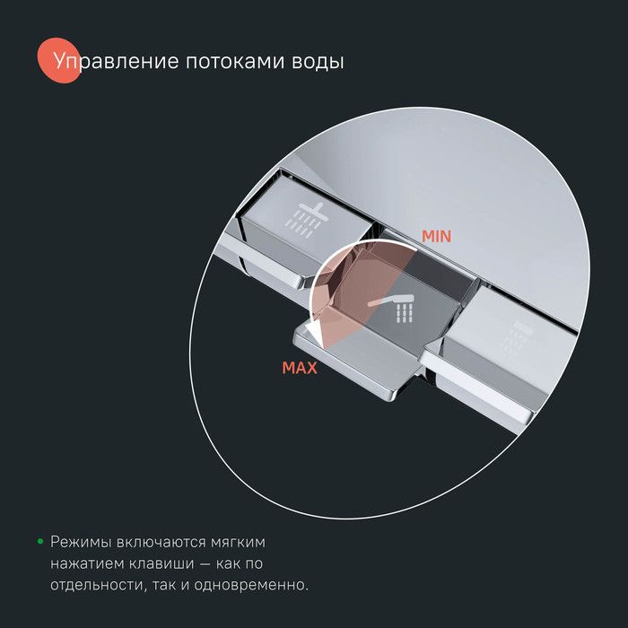 3 выхода для воды: излив, верхняя лейка, ручная лейка. Каждый из них включается мягким нажатием клавиши – как по отдельности, так и одновременно.