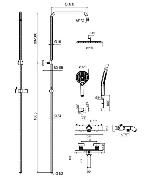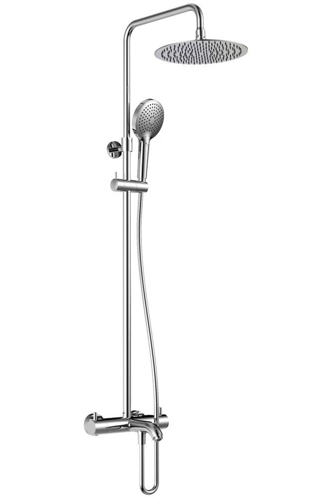 состоит из: верхний душ, ручной душ, термостатический смеситель для ванны, штанга для душа, держатель для душа; верхний душ 250 1jet из нержавеющей стали; размер душевого диска: 250 мм, тип струи: Rain; душевая лейка 120 мм, 3 режима струи, переключение Select; шарнирное соединение: регулируемый угол верхнего душа;длина держателя для душа: 345,5 мм;держатель для ручного душа регулируемый по высоте; поворотный держатель для душа; вид монтажа: внешний монтаж; соединительная резьба G ½; межосевое подключение 150 мм ± 12 мм; телескопическая штанга; подъемная труба может быть укорочена по высоте 90-550 мм; термостатический картридж Vernet; дивертер Citec; шланг 1500 мм с защитой от перекручивания; 2 года гарантии.