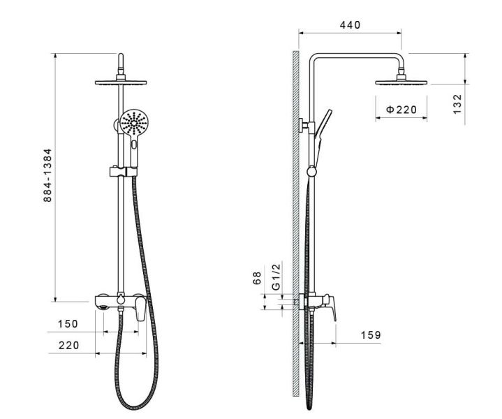 • регулируемая душевая штанга из нержавеющей стали, выдвигающаяся до 1384 мм в высоту