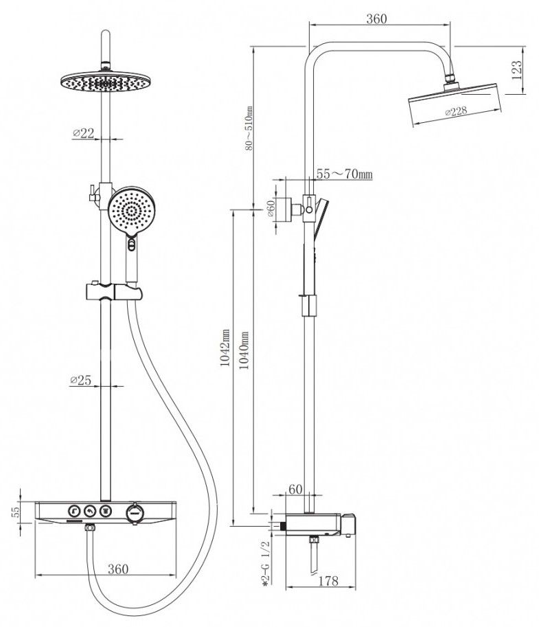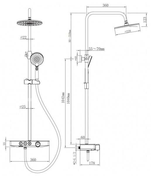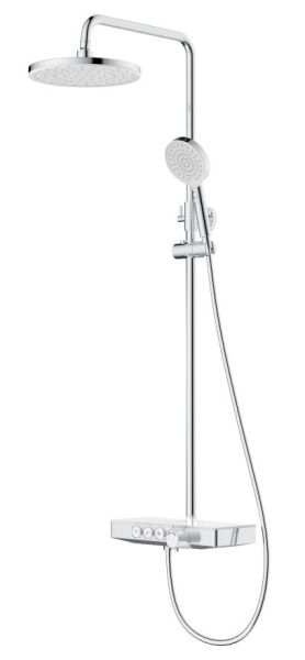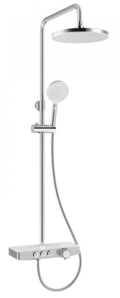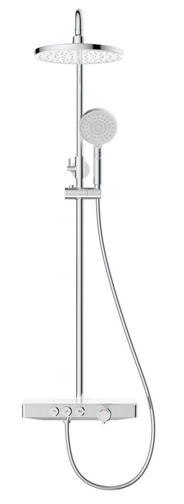 Душевая стойка BERGES MORANS обладает трёхрежимной системой и включает в себя: Верхний Душ «Тропический ливень». Ручной Душ и Излив для наполнения ванны.Система оборудована термостатическим управлением, что позволяет поддерживать комфортную и неизменную температуру воды, а так же оберегает от ожогов.Верхний душ диаметром 25 см обеспечивает комфортное принятие SPA процедур, держатель верхнего душа имеет размер вылета из стены 40 см.Шланг для Ручного Душа выполнен из мягкого пластика длиной 150 см, что обеспечивает долгий срок службы, а так же гибкость, необходимую, для удобного применения.Форма корпуса смесителя выполнена в виде полочки из закаленного стекла, позволяя комфортно хранить необходимые принадлежности для душа.Регулируемая стойка выполнена из нержавеющей 201 стали с гальваническим покрытием.Душевая стойка BERGES MORANS совмещает в себе удобство эксплуатации и современный эстетичный дизайн, позволяя создавать красивое и эргономичное внутреннее пространство всего помещения.Трехфункциональный термостатВстраиваемая системаЛатунный корпусСталинитовая пластина и пластиковая крышка для защиты от ожоговДушевой шланг 150 см из ПВХВерхний тропический душ 25см ABS пластикРегулируемая по высоте штанга из нержавеющей стали 110-155 смМатериал ручного душа: ABS пластикСистема против известковых отложенийЭкономия расхода водыСтандарт подводки: 1/2"Кол-во режимов ручного душа: 2