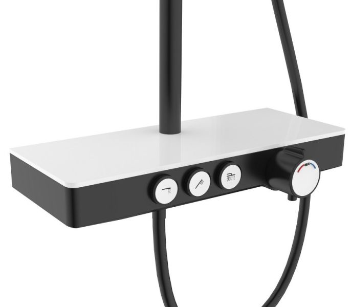 Душевая стойка BERGES MORANS обладает трёхрежимной системой и включает в себя: Верхний Душ «Тропический ливень», Ручной Душ и Излив для наполнения ванны.Система оборудована термостатическим управлением, что позволяет поддерживать комфортную и неизменную температуру воды, а так же оберегает от ожогов.Верхний душ диаметром 25 см обеспечивает комфортное принятие SPA процедур, держатель верхнего душа имеет размер вылета из стены 40 см.Шланг для Ручного Душа выполнен из мягкого пластика длиной 150 см, что обеспечивает долгий срок службы, а так же гибкость, необходимую, для удобного применения.Форма корпуса смесителя выполнена в виде полочки из закаленного стекла, позволяя комфортно хранить необходимые принадлежности для душа.Регулируемая стойка выполнена из нержавеющей 201 стали с гальваническим покрытием.Душевая стойка BERGES MORANS совмещает в себе удобство эксплуатации и современный эстетичный дизайн, позволяя создавать красивое и эргономичное внутреннее пространство всего помещения.Трехфункциональный термостат
