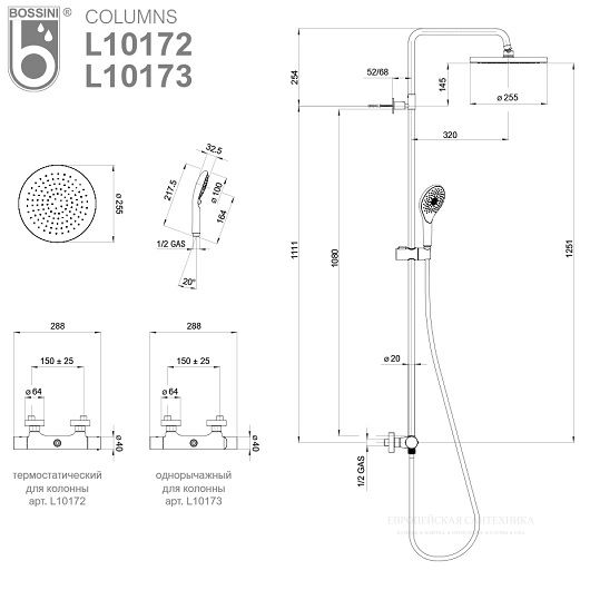 Bossini Elios душевая система: термостат, стойка, верхний поворотный душ ABS Elios 25 см, с ручным душем, цвет хром.