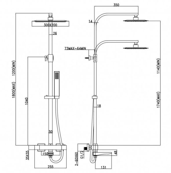 - Регулировка верхнего душа по высоте: 114 - 174 см.