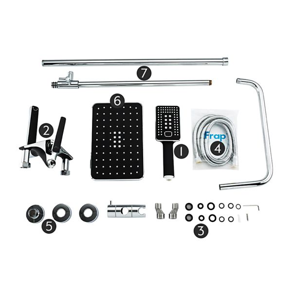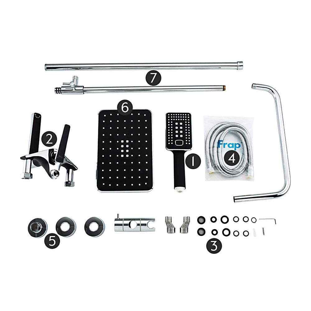 смеситель, душевая стойка, верхний душ, душевая лейка, душевой шланг, держатель для душевой лейки, настенный держатель, отражатели, эксцентрики