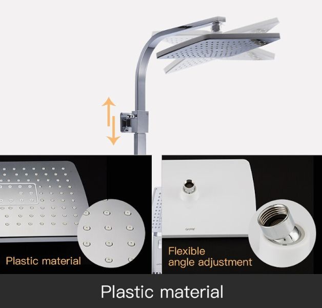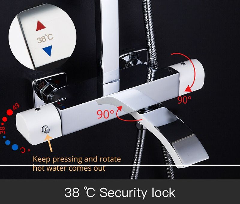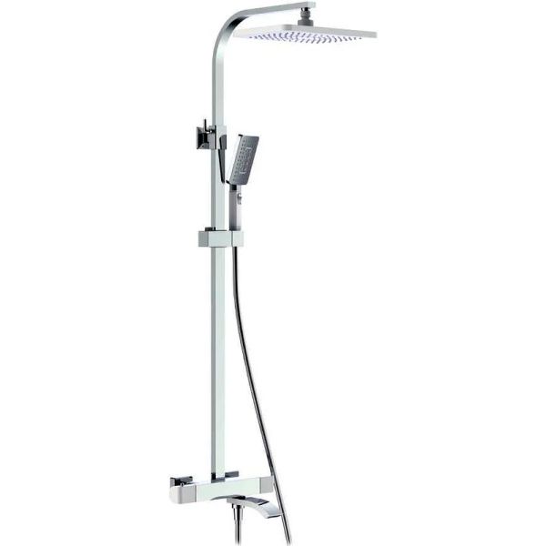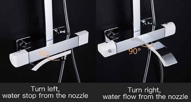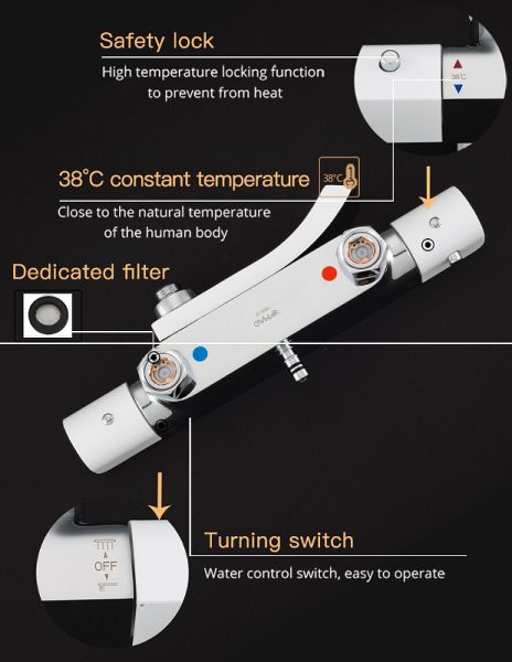- Комплектация: с душевой лейкой, с шлангом для душа, верхний душ, излив, с настенным держателем, смеситель с термостатом