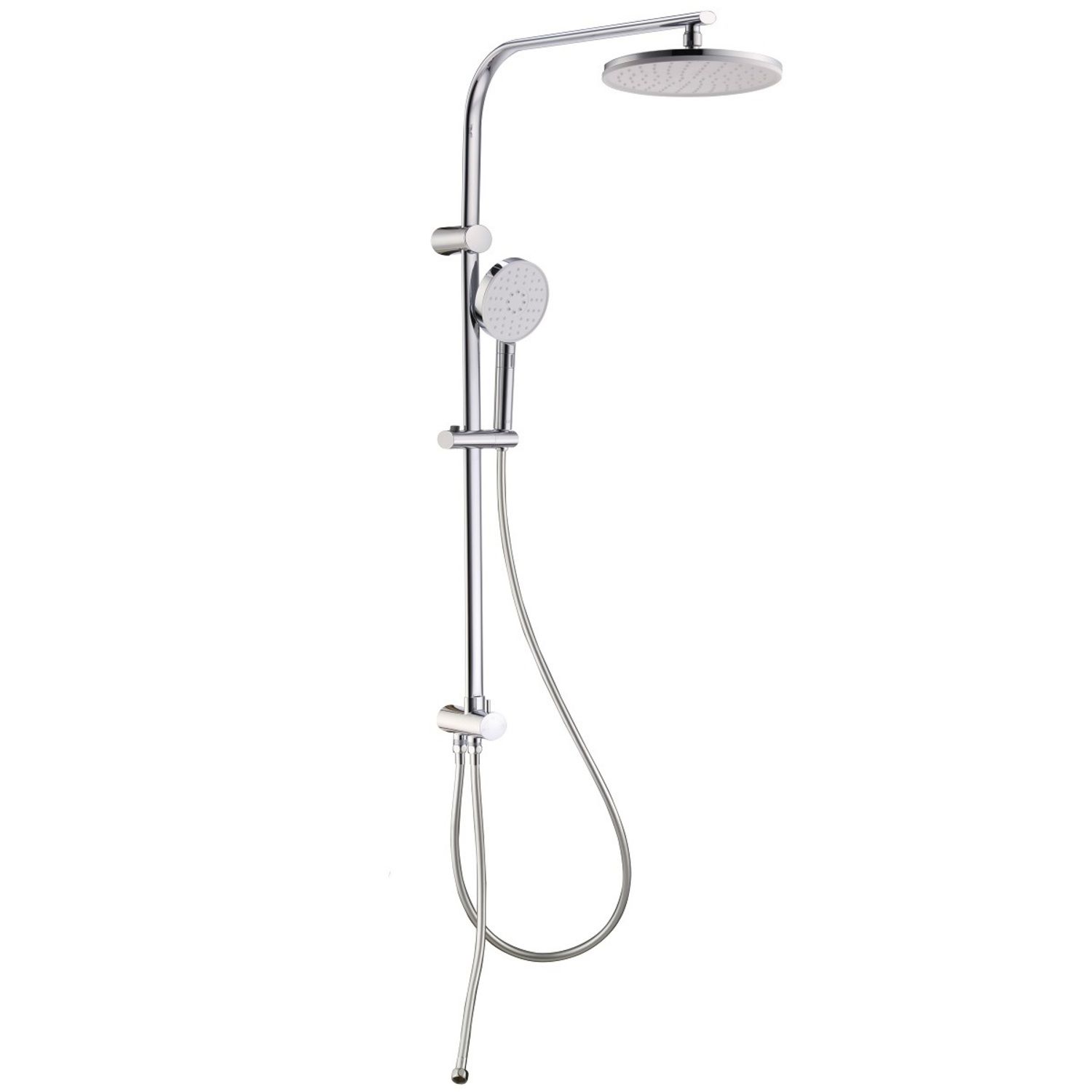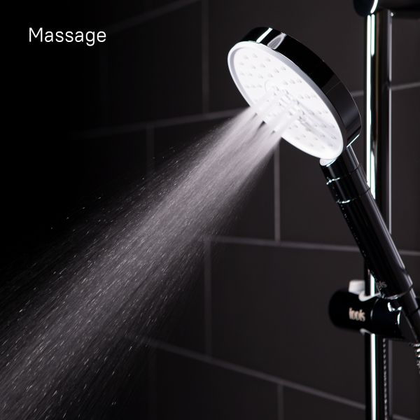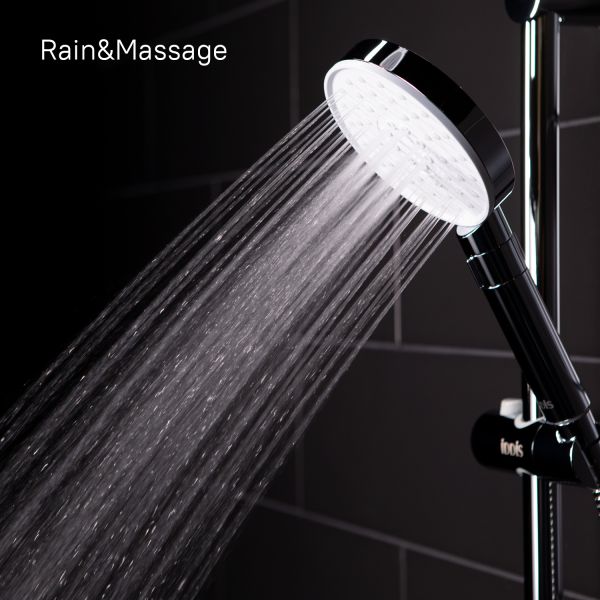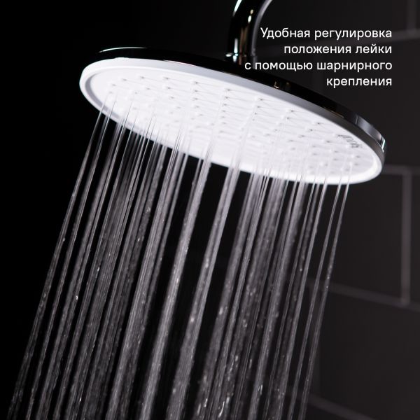 Душевой гарнитур с верхней лейкой. Стойка из нержавеющей стали с никель-хромовым покрытием, высота стойки 970 мм. Материал корпуса дивертора - ABS-пластик. Шланг для душа из ПВХ, 1,5 м и 0,6 метра, цвет серебряный, с системой от перекручивания Twist Free. Верхняя лейка из ABS-пластика, диаметр 225 мм, хром/белый матовый. Ручная лейка из ABS-пластика, диаметр 120 мм, хром/белый матовый, 3 режима (Rain, Massage, Rain&Massage), переключение на ручке с помощью слайдера. В комплекте: крепеж.
