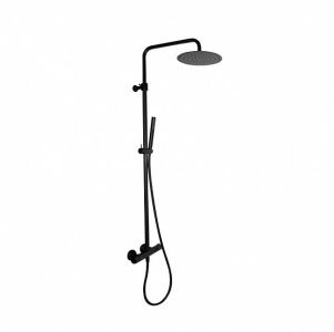 Душевая колонна с термостатическим смесителем в комплекте с переключателем потоков, круглой верхней одноструйной душевой лейкой из нержавеющей стали, с ручным душем и шлангом из ПВХ. Внимание: для чистки черных и цветных изделий можно применять только мягкую губку и мыльный раствор. Использование моющих и абразивных средств запрещено.