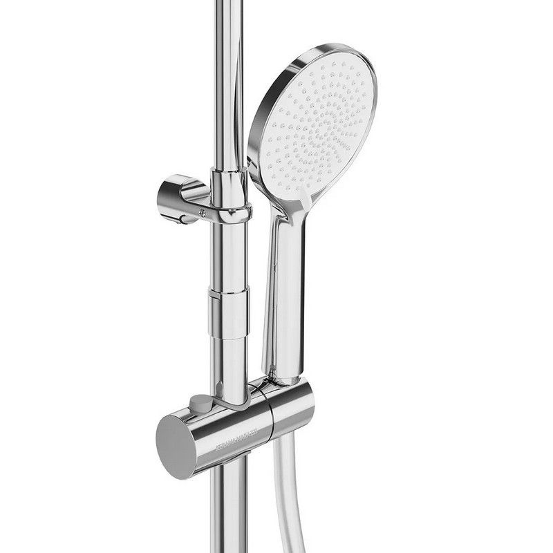 Верхний душ и ручная лейка имеют круглую форму. Стойка выполнена из нержавеющей стали, круглая в сечении. У ручной лейки предусмотрены три режима потока. Регулировка высоты при установке — 855-1255 мм.