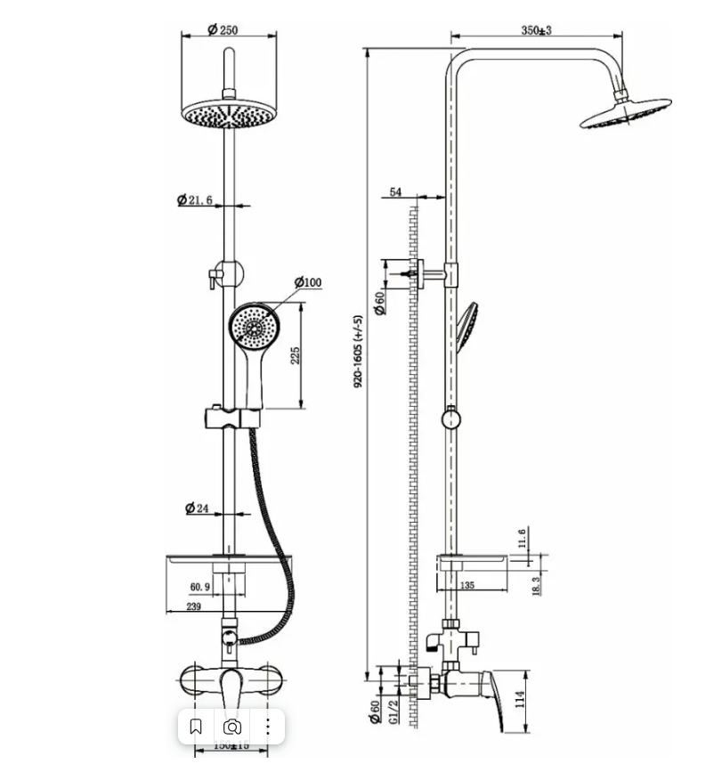 Аксессуары в комплекте (шланг 1,5 м, 1-функциональная лейка с функцией легкой очистки Ø100х225 мм, регулируемое по высоте крепление для лейки, полочка для душевых принадлежностей)