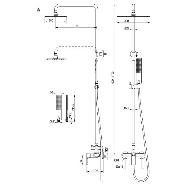 - Аксессуары в комплекте (верхняя душевая лейка «Тропический дождь 200x300 мм,1-функциональная лейка 68x272 мм, регулируемое по высоте крепление для лейки, душевой шланг 1,5 м)