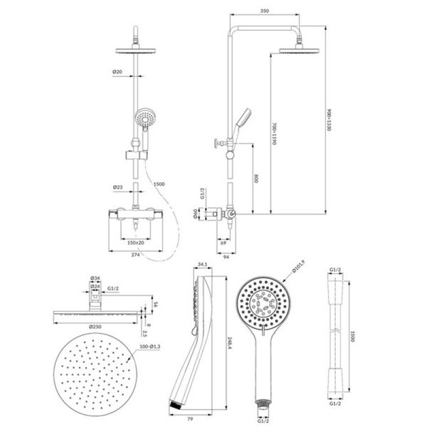 - верхний душ латунный (WG125GL), размер: ø25 см, отдаленность от стены: 43 см