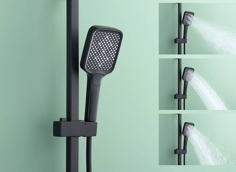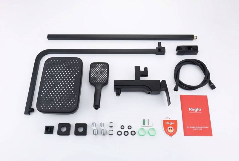 Душевая система Raglo R02.24.06Цвет: черный.Материал: латунь.Управление: однорычажное.Механизм: керамический картридж.Излив: поворотный. Аэратор.Тип излива: каскадный.Регулируемая по высоте душевая штанга: 1082-1650 мм.Форма верхнего душа: прямоугольная.Размер верхнего душа (ШхД): 315х208 мм.Регулируемый по высоте и наклону держатель ручного душа.Форма ручного душа: прямоугольная.Количество режимов струи ручного душа: 3.Отверстия для монтажа: 3.Стандарт подводки: G 1/2.Монтаж: на стену.