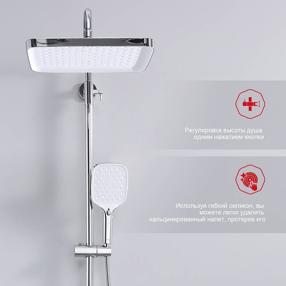 Душевая система Raglo R50.24.Материал: латунь.Управление: однорычажное.Механизм: керамический картридж.Излив: поворотный. Аэратор.Регулируемая по высоте душевая штанга: 1225-1675 мм.Форма верхнего душа: прямоугольная.Размер верхнего душа 312х212 мм.Регулируемый по высоте держатель ручного душа.Количество режимов струи ручного душа: 3.Отверстия для монтажа: 3.Стандарт подводки: G 1/2.Монтаж: на стену.