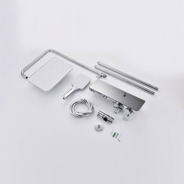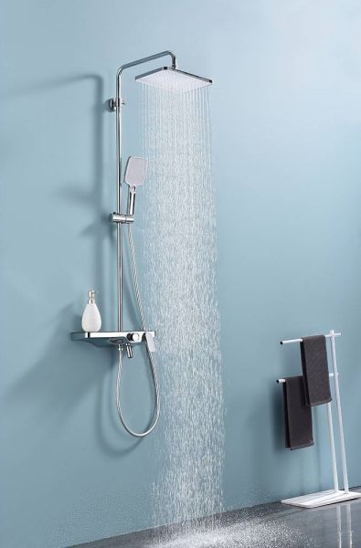 Душевая система Raglo R60.24.Материал: латунь.Управление: однорычажное.Механизм: керамический картридж.Скрытый излив с аэратором.Полка из стекла.Регулируемая по высоте душевая штанга: 1100-1530 мм.Форма верхнего душа: прямоугольная.Размер верхнего душа (ШхД): 300х200 мм.Регулируемый по высоте держатель ручного душа.Количество режимов струи ручного душа: 3.Переключение режимов ручного душа: кнопочное.Отверстия для монтажа: 3.Стандарт подводки: G 1/2.Монтаж: на стену.