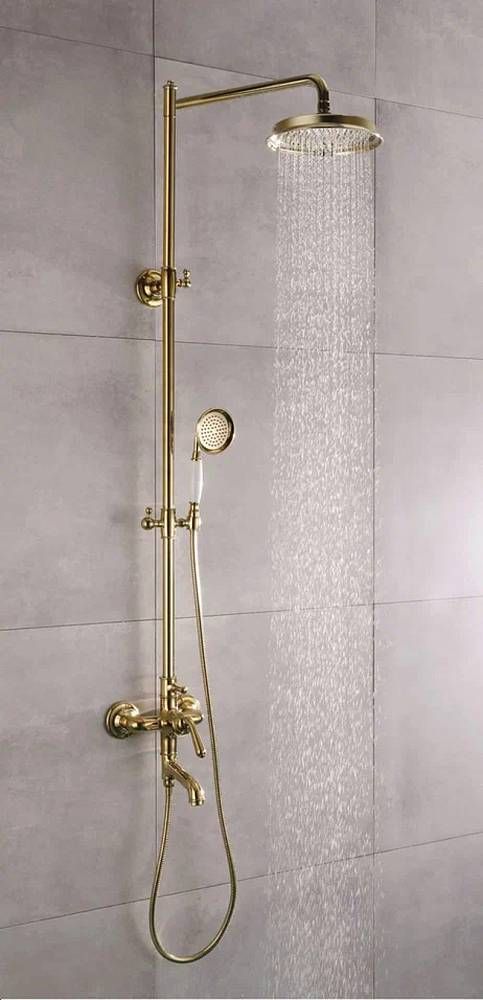 Душевая система Rose R0236E, золото.Монтаж: настенный.Стилистика дизайна: ретро.Управление: рычажное.Размер верхнего душа: 23x23.Форма верхнего душа: круглая.