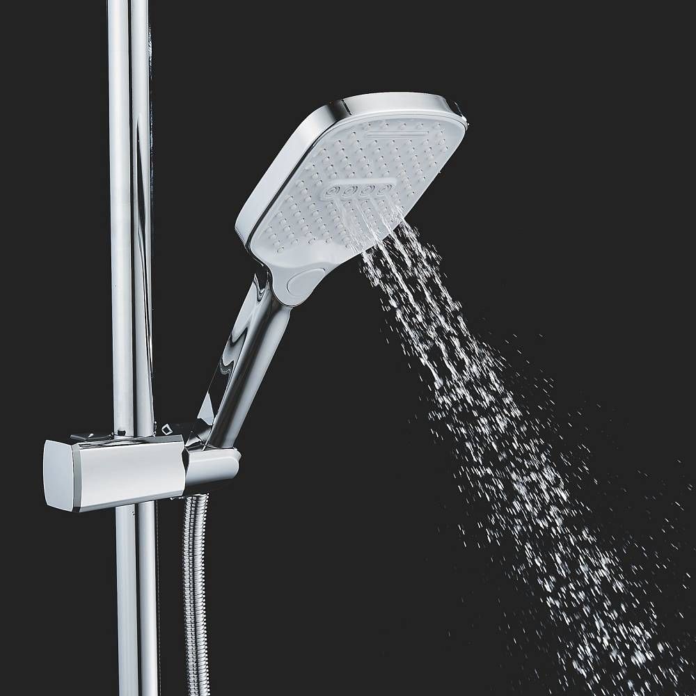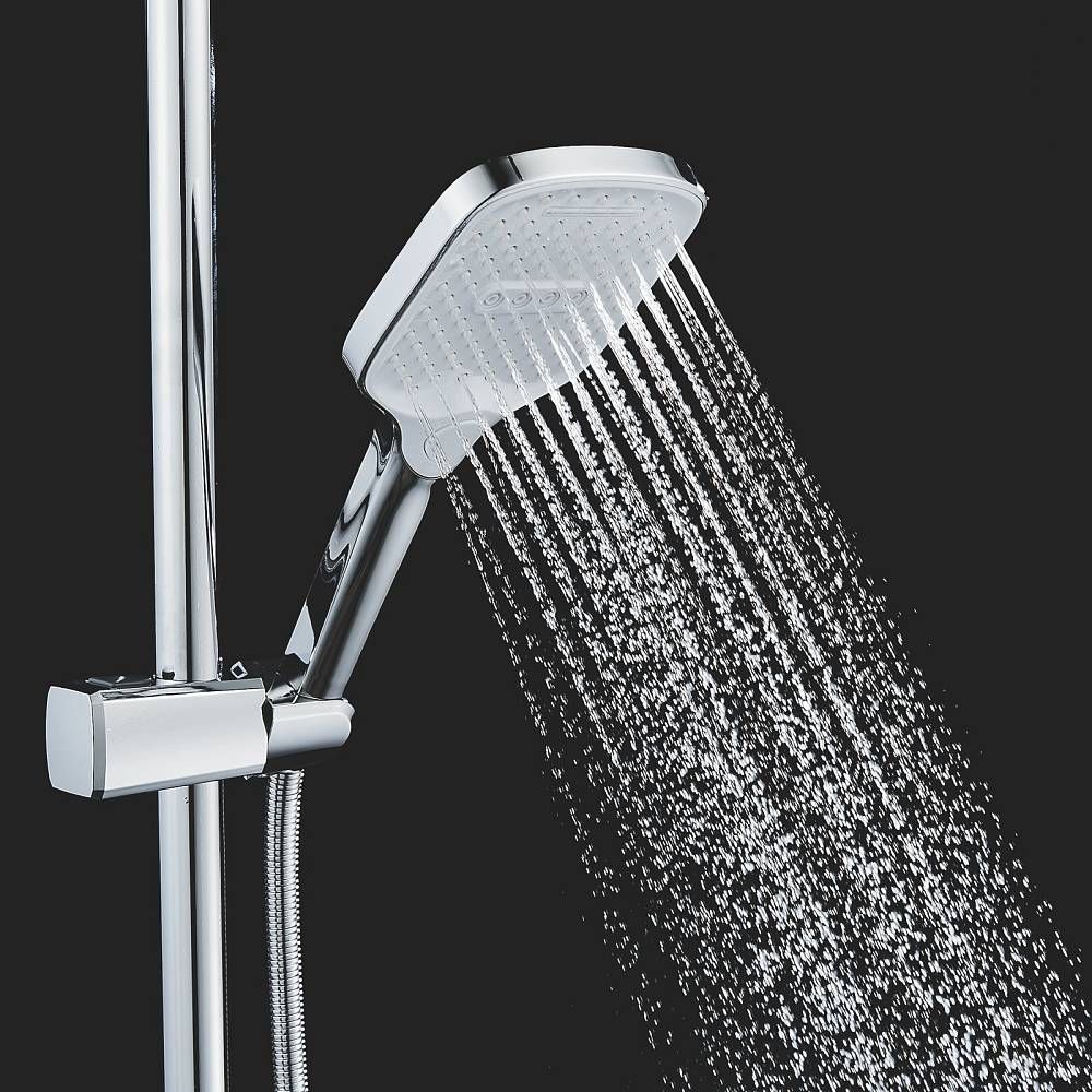 Верхний душ размером 310x210 мм из ABS-пластика легко регулируется по наклону благодаря встроенному шарниру. Он также оснащен самоочищающимися силиконовыми форсунками, которые защищают его от известкового налета, обеспечивая всегда чистый и сильный поток воды.