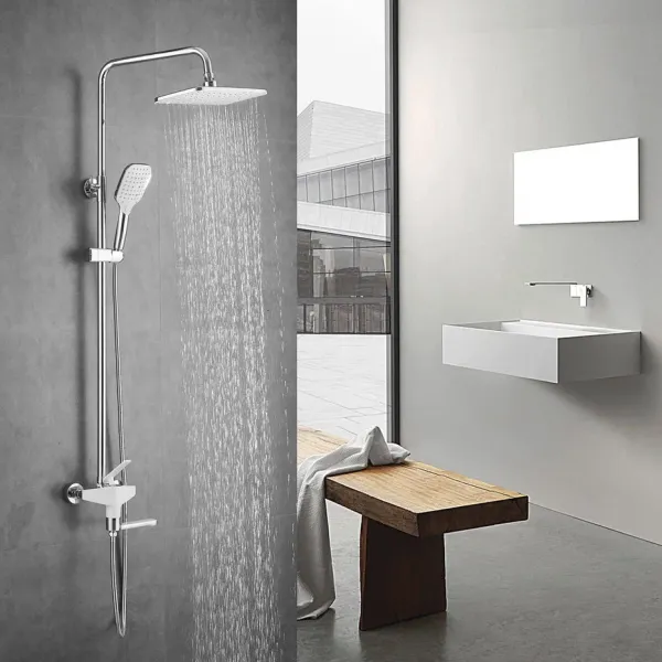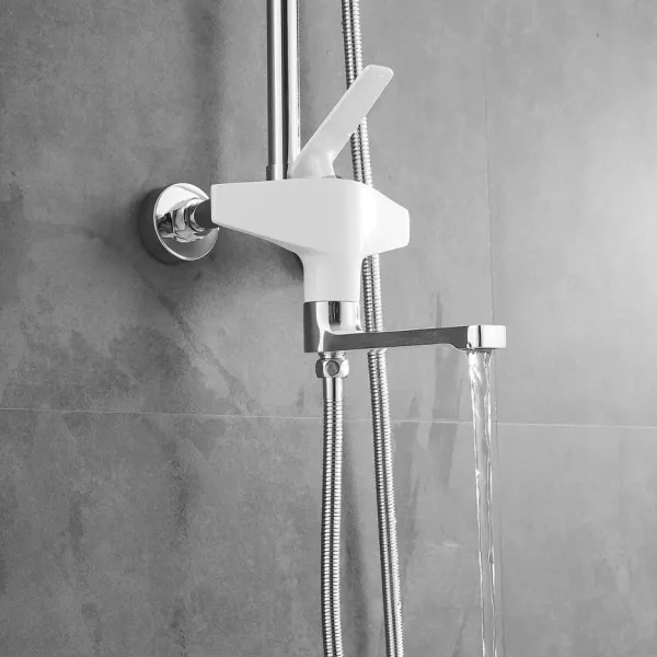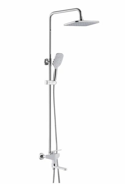 Душевая система Shevanik S8036F, белый/хром.Количество режимов струи: 3.Размер верхнего душа: 29,5x18 см.Управление: рычажное.Излив для наполнения ванны: да.