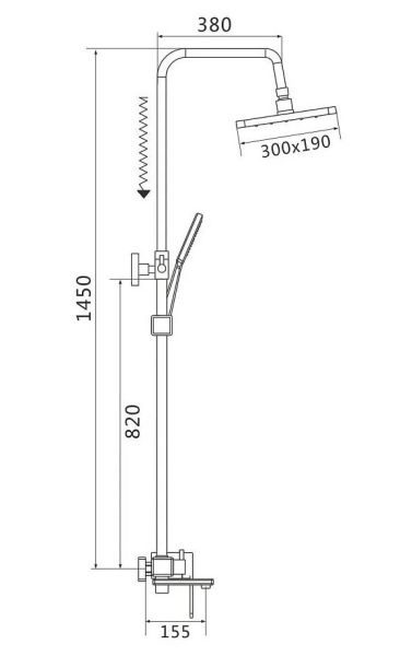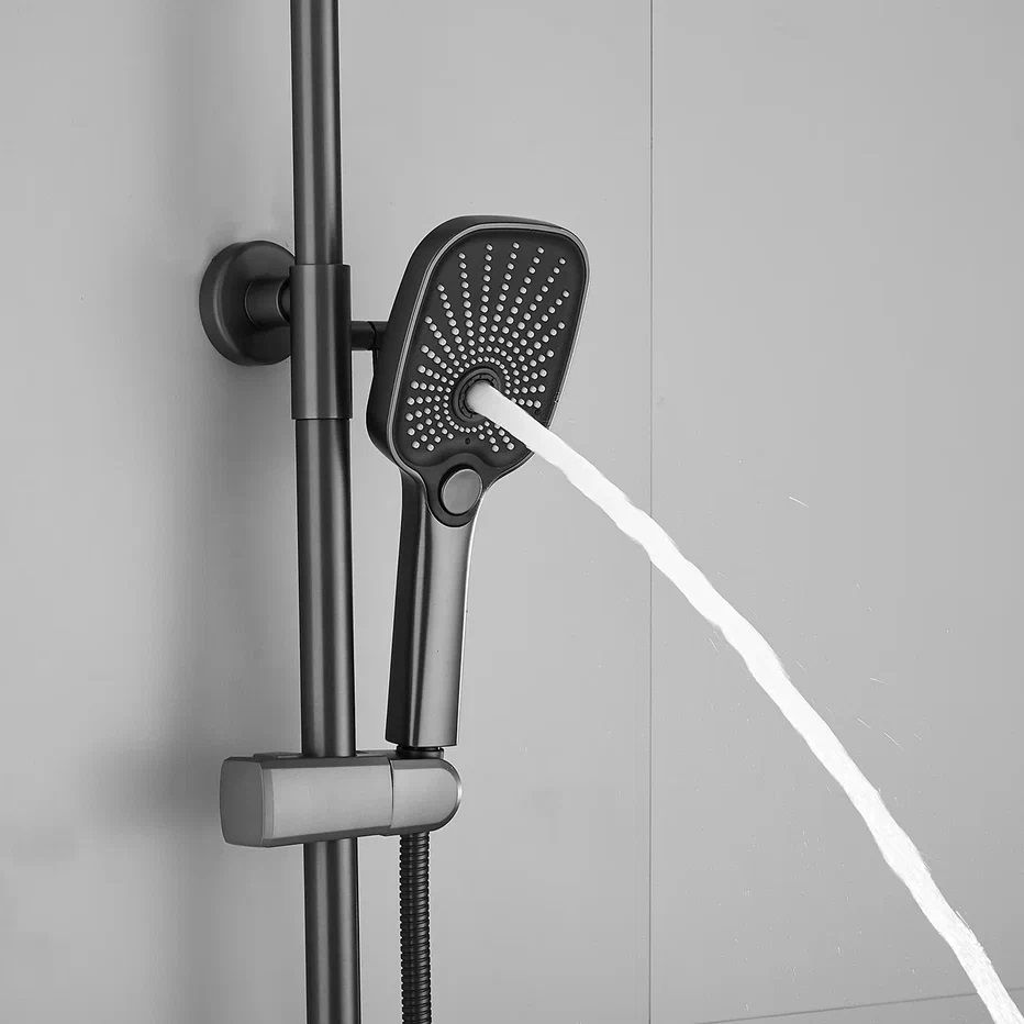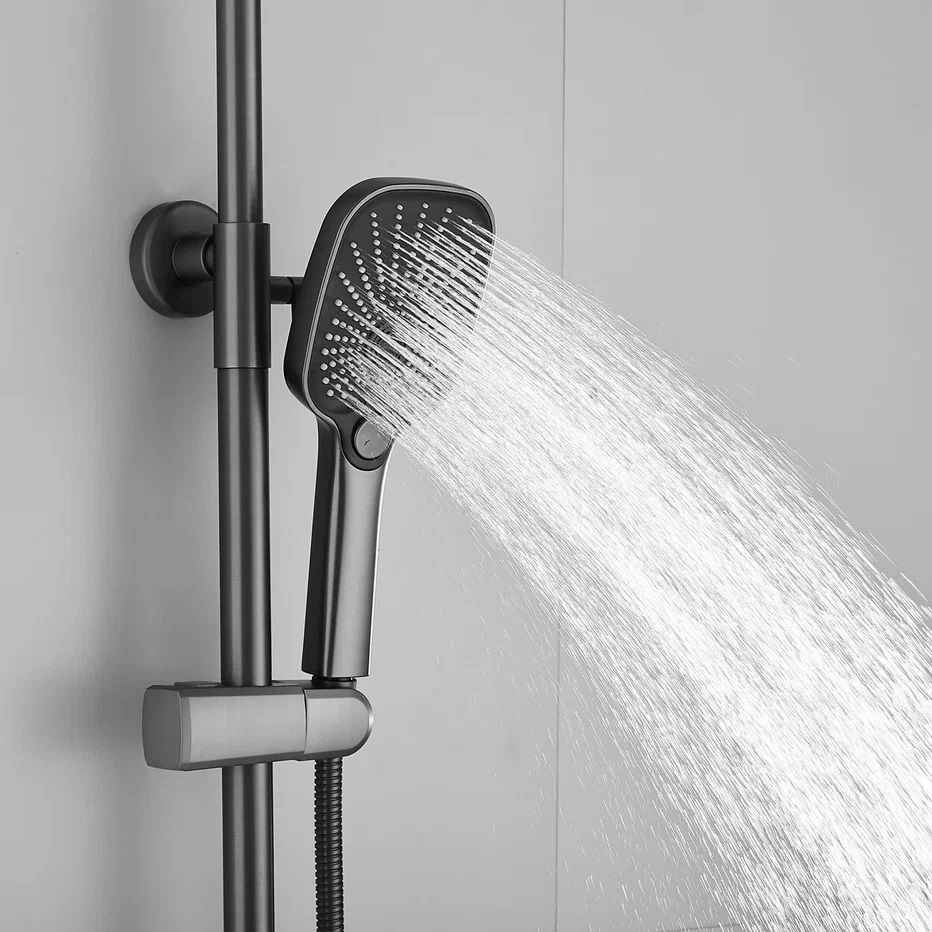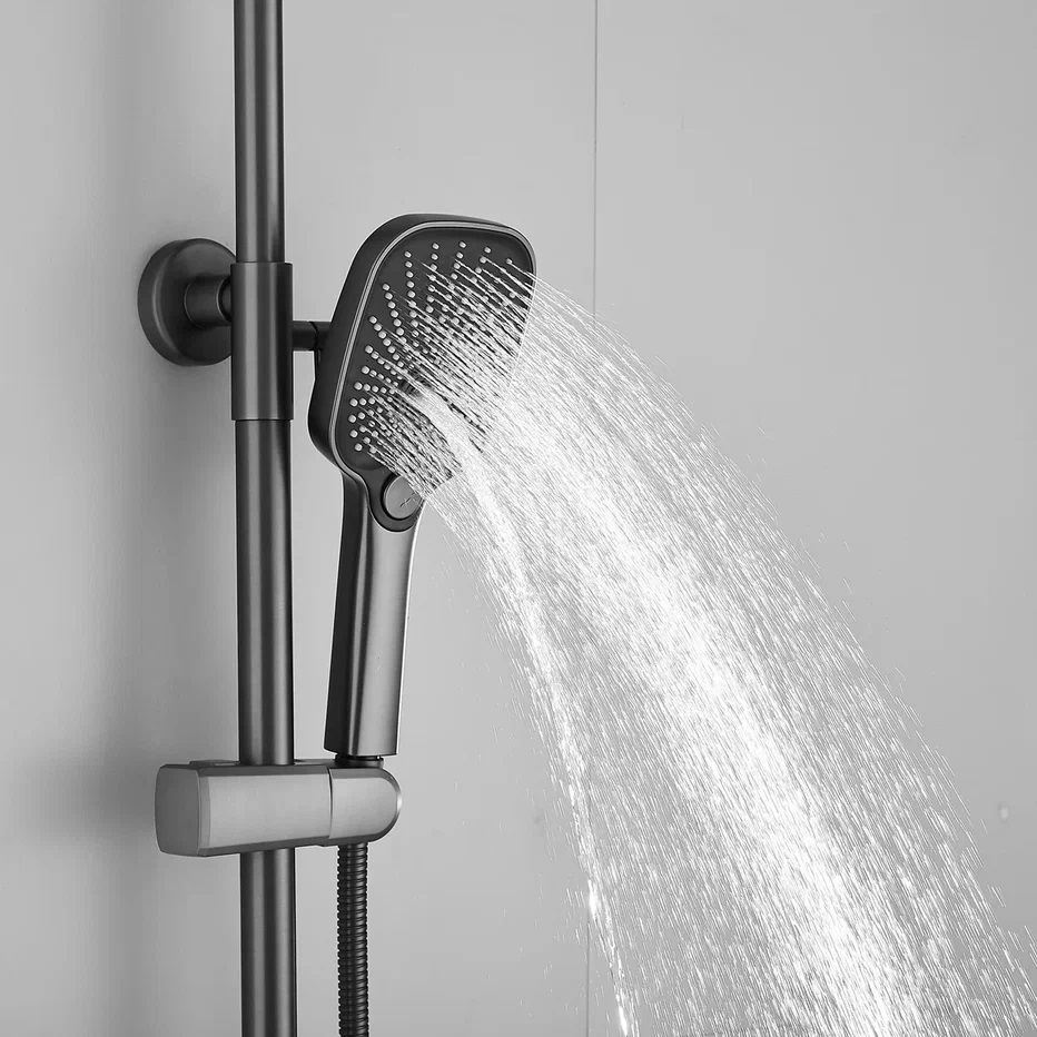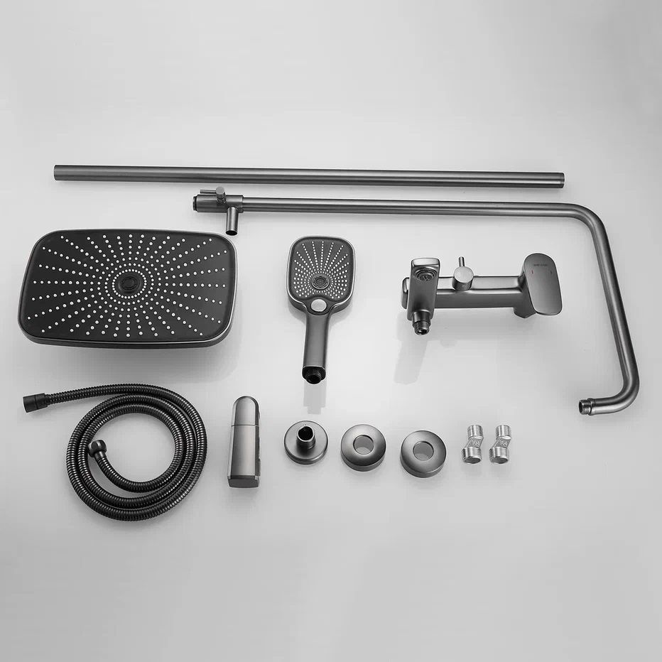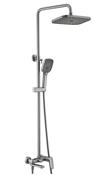 Душевая система Shevanik S8536T, оружейная сталь.Количество режимов струи: 3.Размер верхнего душа: 30x19 см.Управление: рычажное.Излив для наполнения ванны: да.