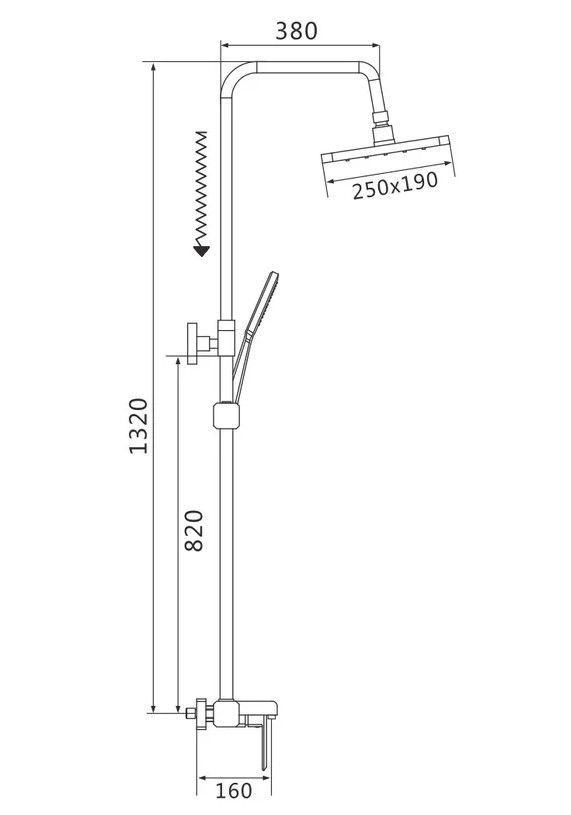 Душевая система Shevanik S8836, хром.Количество режимов струи: 2.Размер верхнего душа: 25x19 см.Управление: рычажное.Излив для наполнения ванны: да.