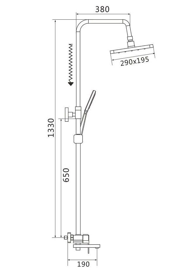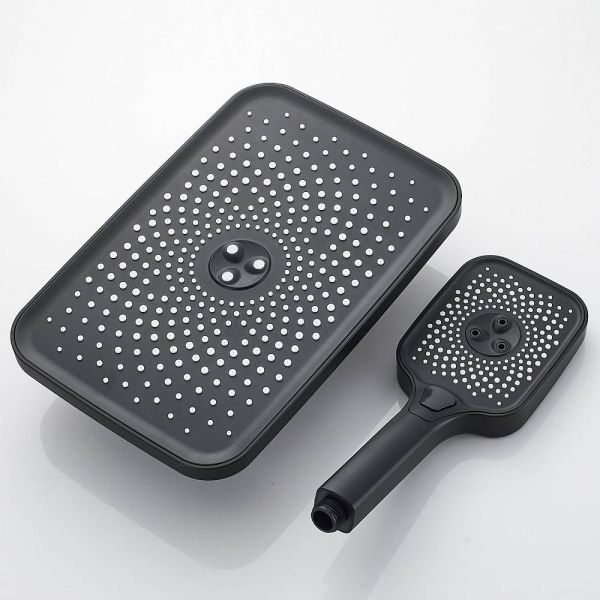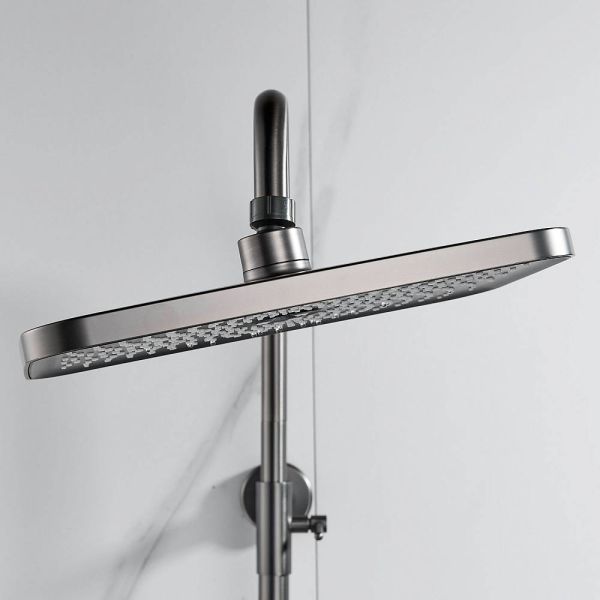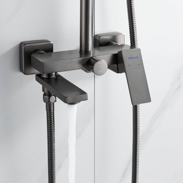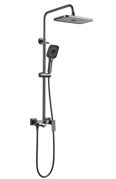 Душевая система Shevanik S9636T, оружейная сталь.Количество режимов струи: 3.Размер верхнего душа: 29x19,5 см.Управление: рычажное.Излив для наполнения ванны: да.