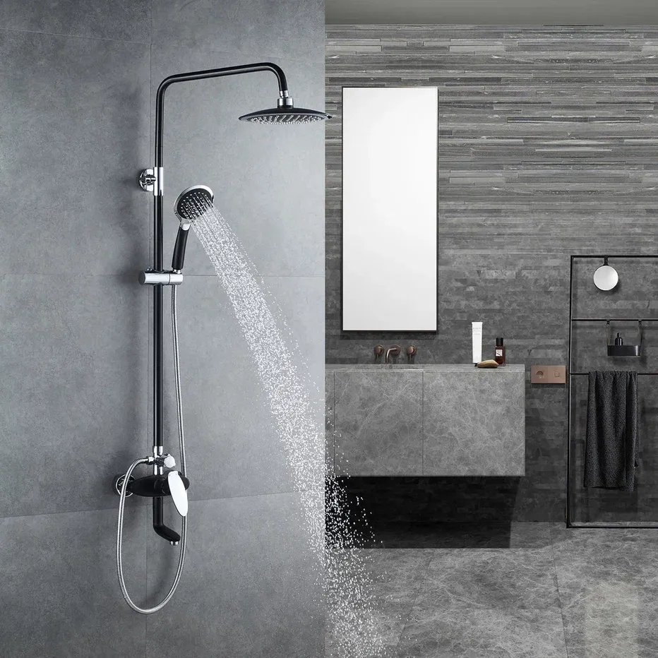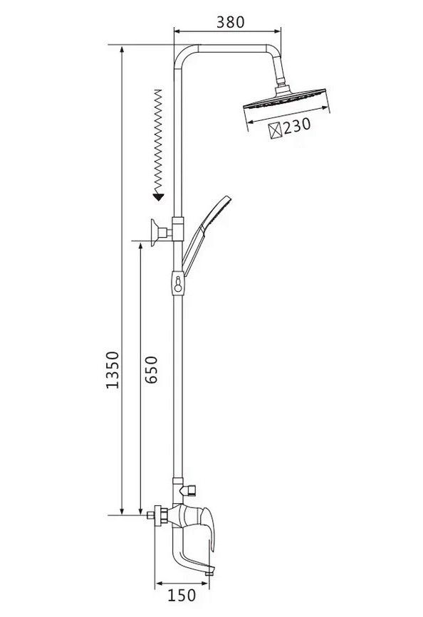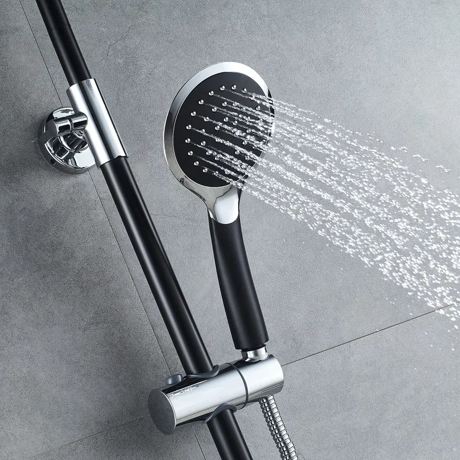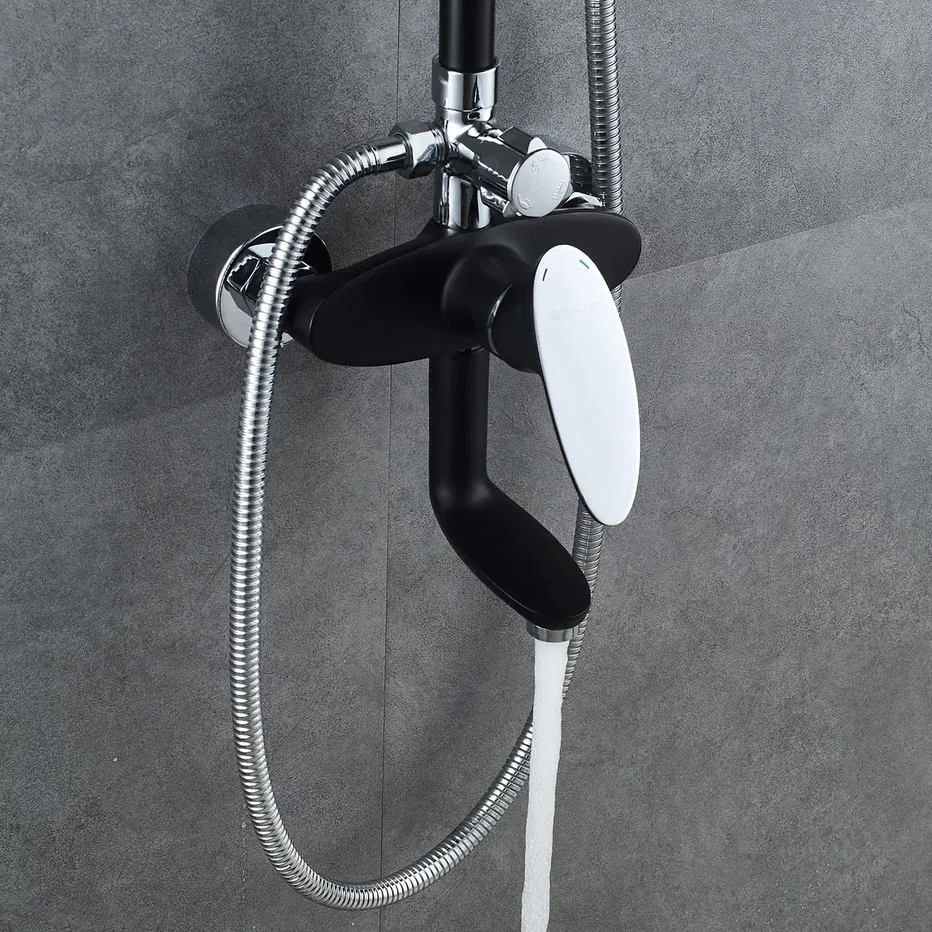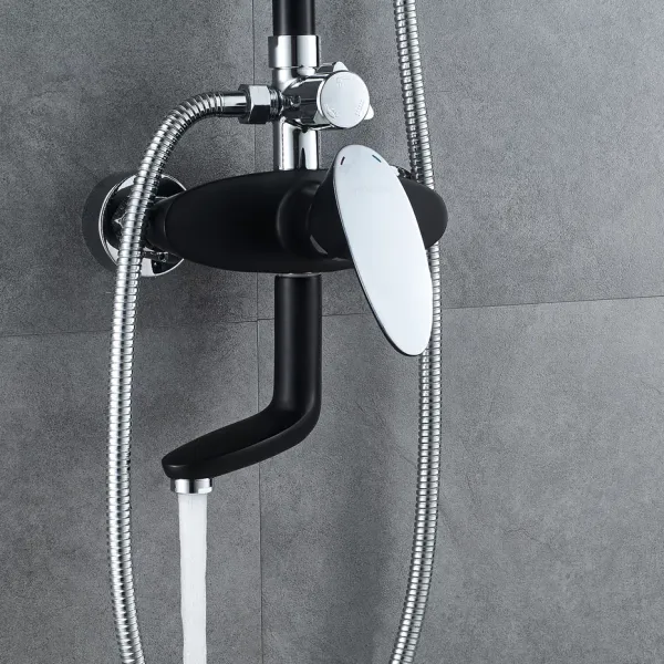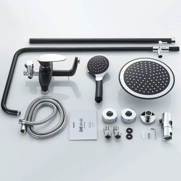 Душевая система Shevanik S9836H, черный/хром.Количество режимов струи: 3.Размер верхнего душа: 23x23 см.Управление: рычажное.Излив для наполнения ванны: да.