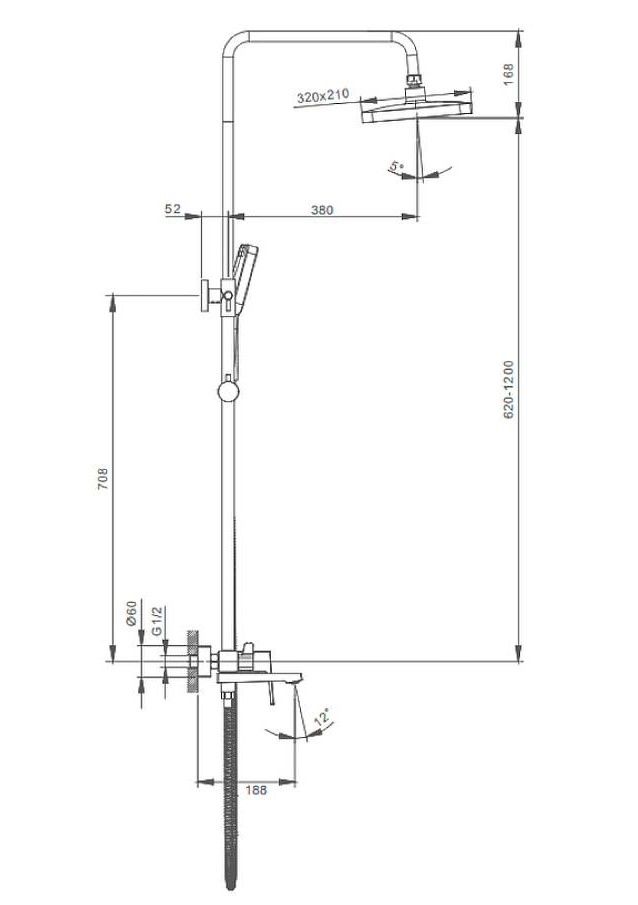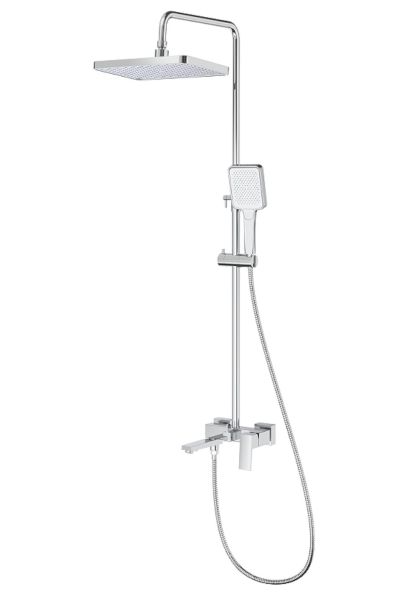 Душевая система Splenka S01.24. Цвет: хром. Материал: латунь. Управление: однорычажное. Механизм: керамический картридж. Излив: поворотный. Аэратор. Стандарт подводки: G 1/2. Форма верхнего душа: прямоугольная. Размер верхнего душа (ШхД): 320х210 мм. Количество режимов струи ручного душа: 3. Регулируемая душевая штанга: 620-1200 мм. Монтаж: на стену.