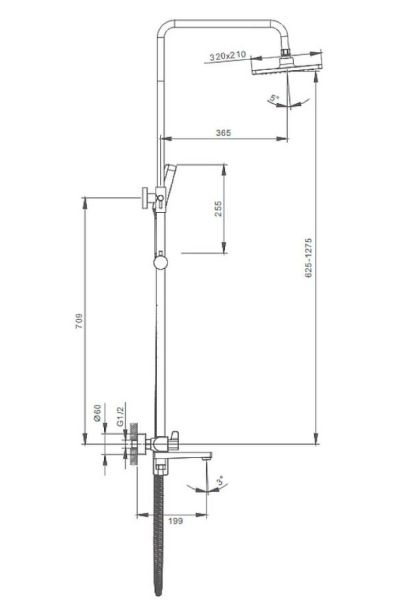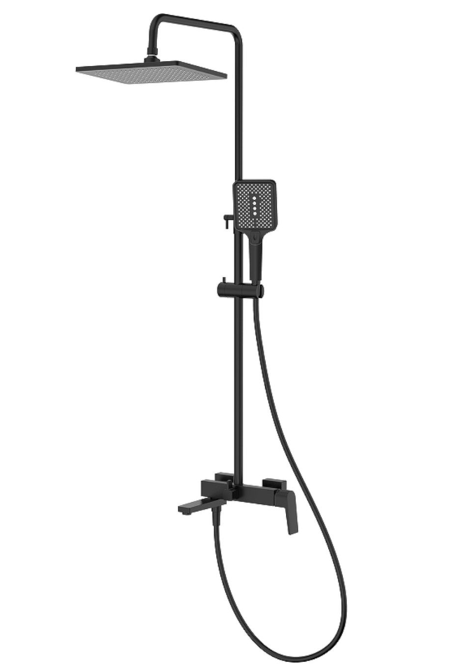 Душевая система Splenka S02.24.06. Цвет: черный. Материал: латунь. Управление: однорычажное. Механизм: керамический картридж. Излив: поворотный. Аэратор. Стандарт подводки: G 1/2. Форма верхнего душа: прямоугольная. Размер верхнего душа (ШхД): 320х210 мм. Количество режимов струи ручного душа: 3. Регулируемая душевая штанга: 625-1275 мм. Монтаж: на стену.