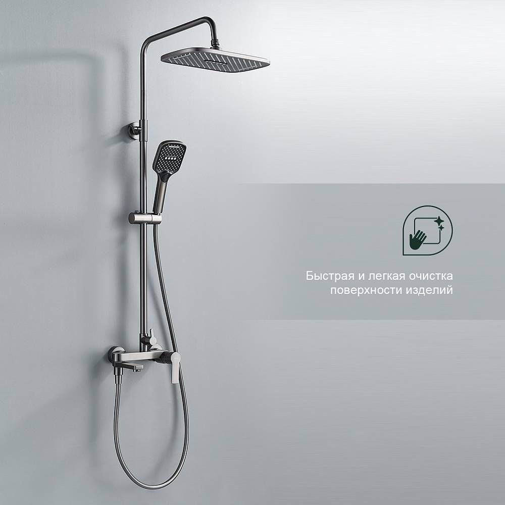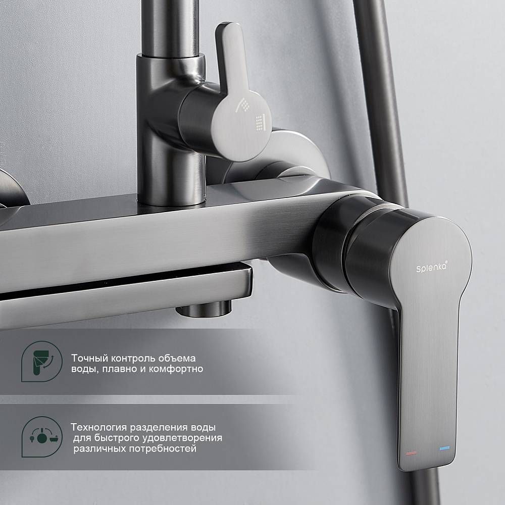 Душевая система Splenka S06.24.09. Цвет: графит. Материал: латунь. Управление: однорычажное. Механизм: керамический картридж. Излив: поворотный. Аэратор. Стандарт подводки: G 1/2. Форма верхнего душа: прямоугольная. Размер верхнего душа (ШхД): 320х210 мм. Количество режимов струи ручного душа: 3. Регулируемая душевая штанга: 770-1425 мм. Монтаж: на стену. Излив - функция переключения.