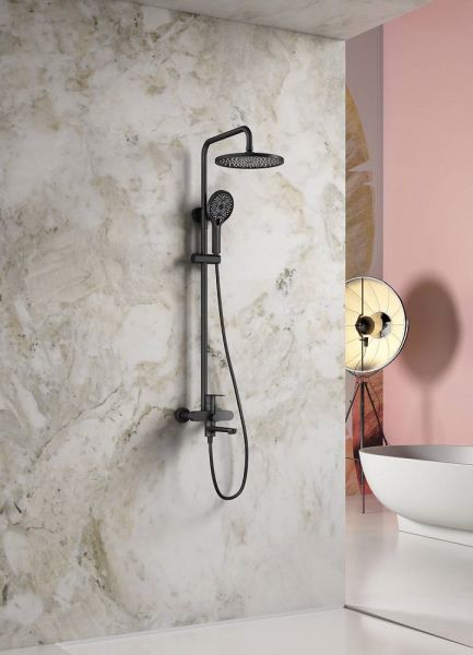 Душевая система Splenka S222.24.06, черный. Душевая система подходит для ванны и душа. Излив у системы имеет функцию переключения режима подачи воды. Верхний душ имеет круглую форму, из авс-пластика. Душевая лейка - 3 режима. Верхний душ - ∅250мм.