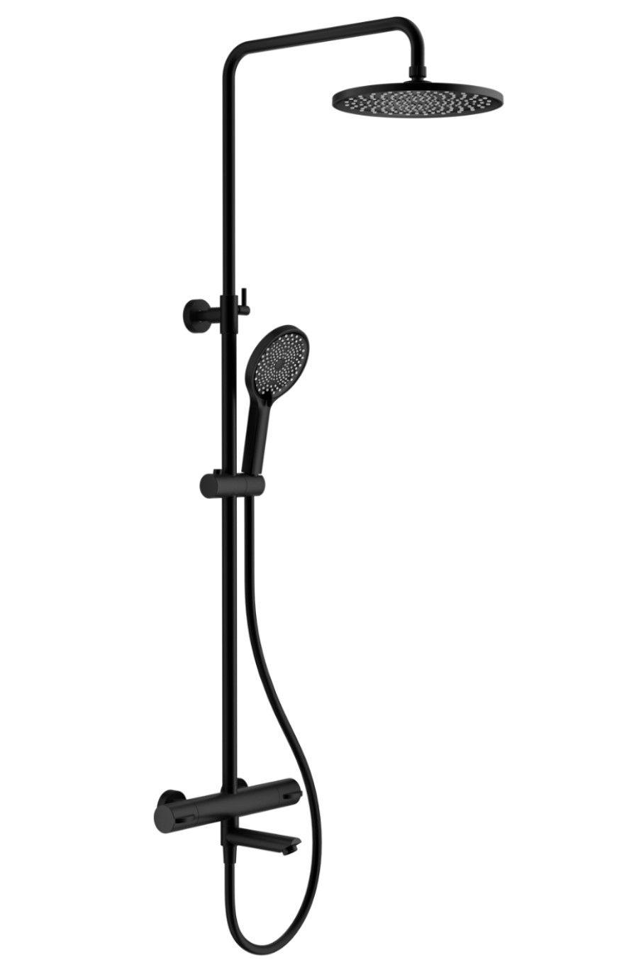 Душевая система с термостатом Splenka S223.26.06, черный. Душевая система термостатическая подходит для ванны и душа. Излив у системы поворотный. Излив - функция переключения режима. Верхний душ имеет круглую форму. Верхний душ - ∅250мм. Ручная лейка у системы 3-х режимная. Лейки изготовлены из авс-пластика.