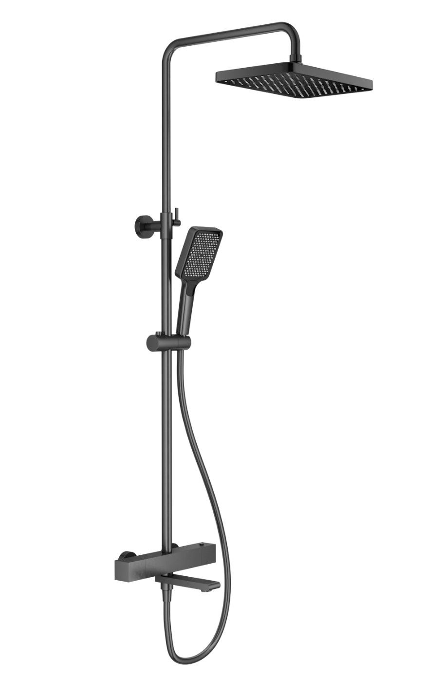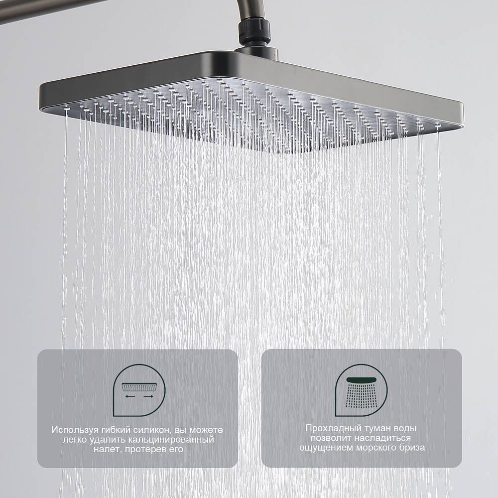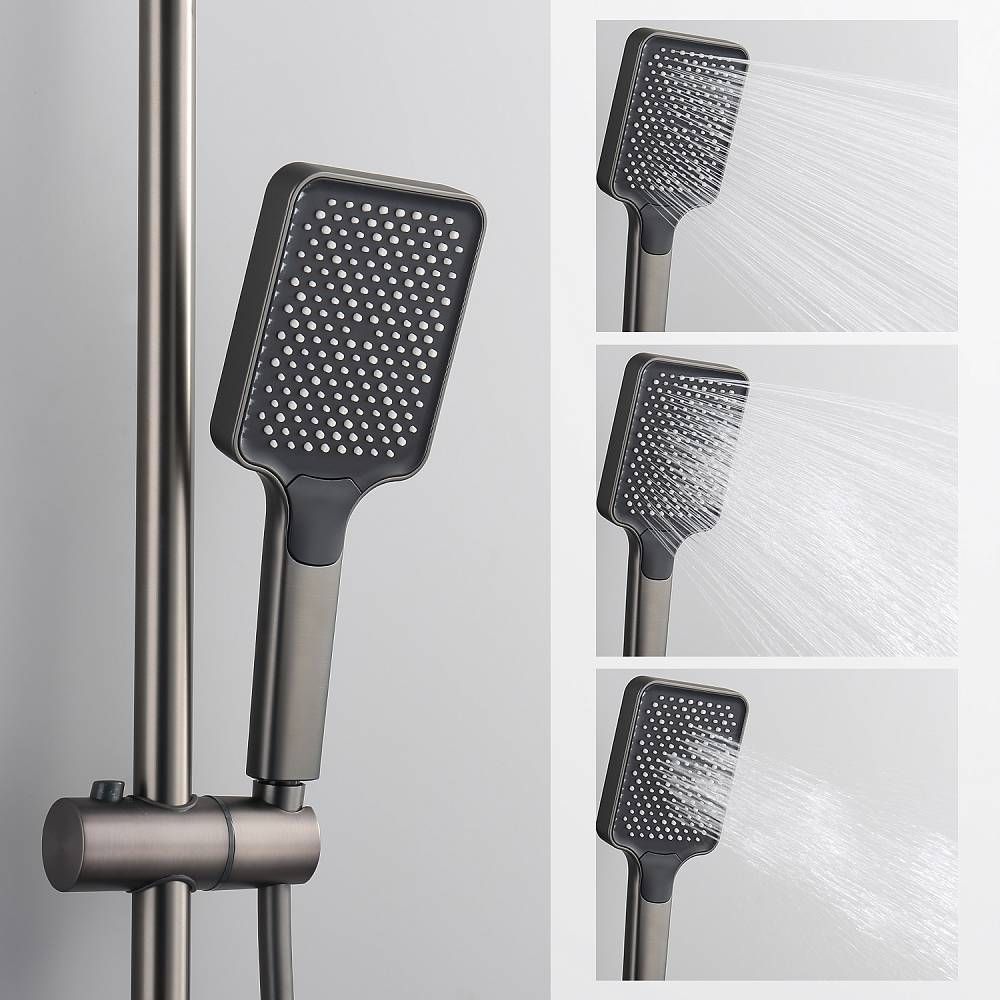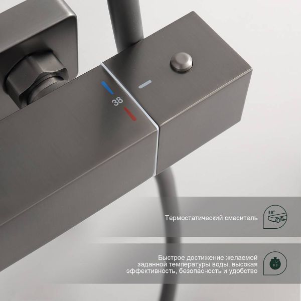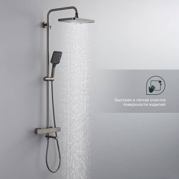 Душевая система с термостатом Splenka S224.26.09, графит. Управление: термостат. Механизм: термостатический картридж. Стандарт подводки: G 1/2. Размер верхнего душа (ШхД): 320х210 мм. Количество режимов струи ручного душа: 3. Регулируемая душевая штанга: 1160-1560 мм. Монтаж: на стену. Излив - функция переключения.