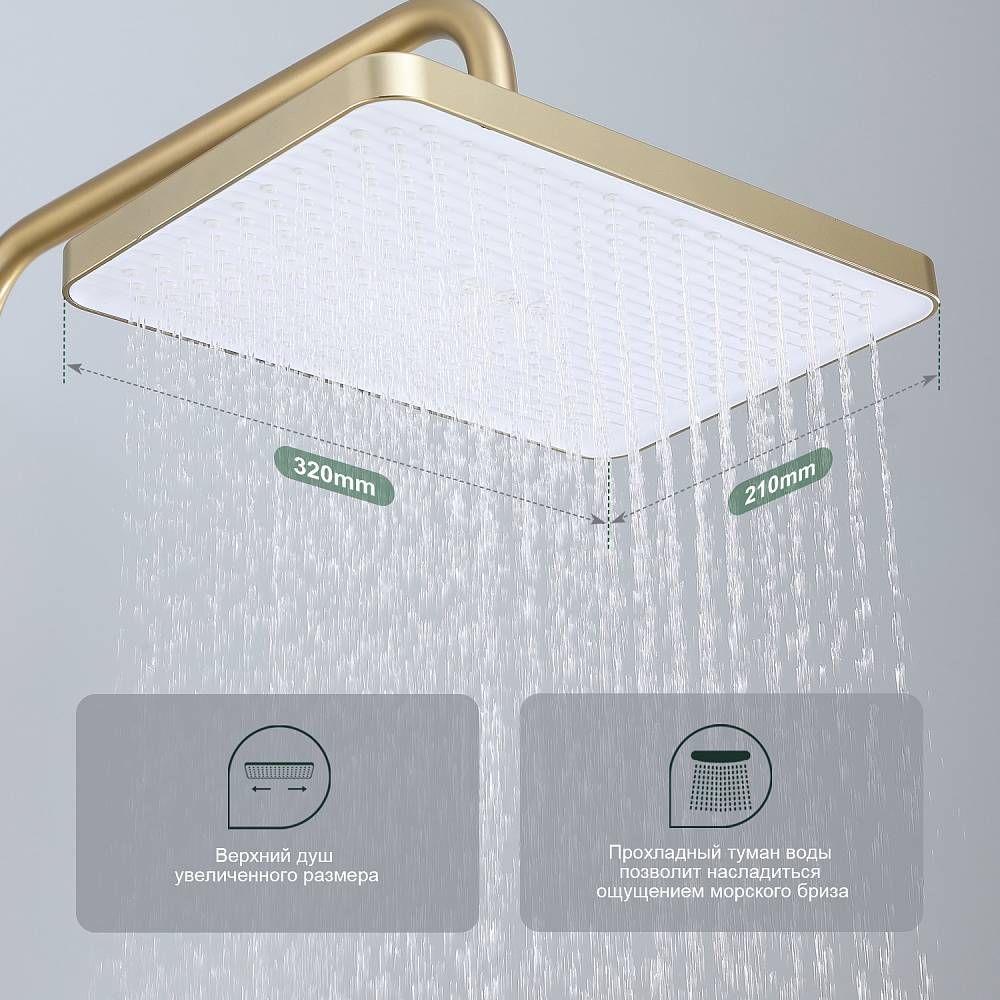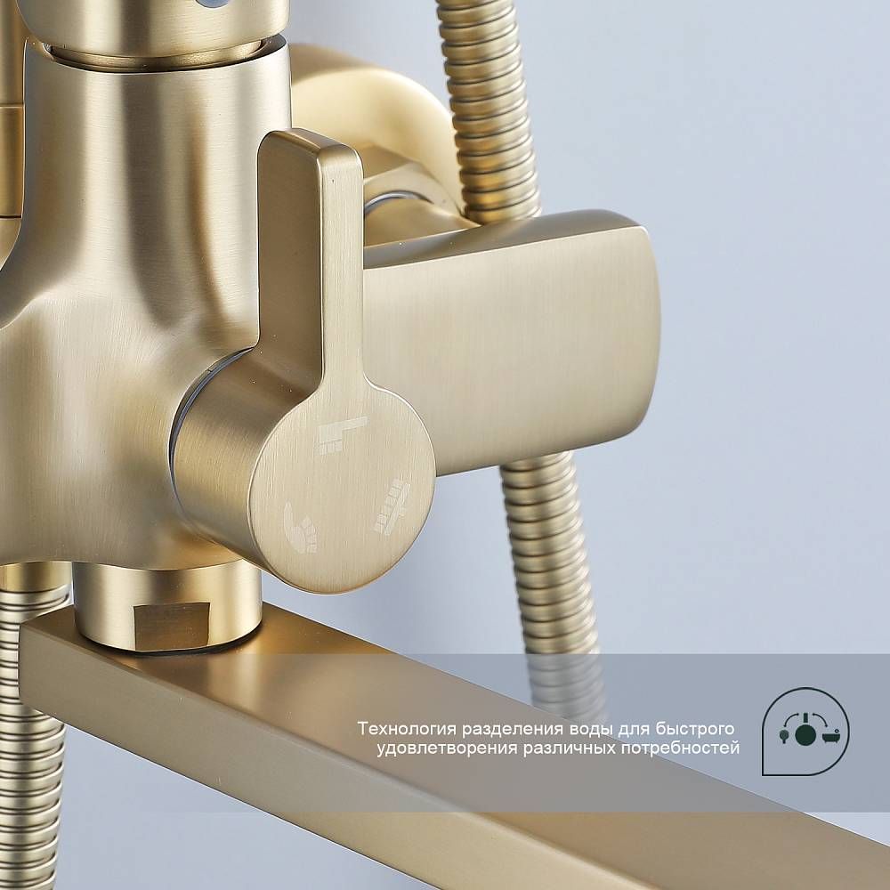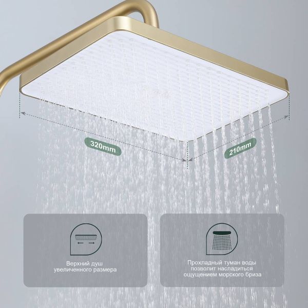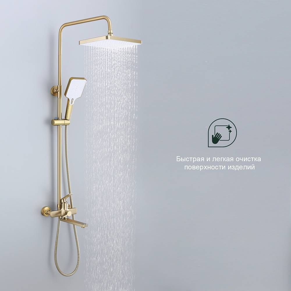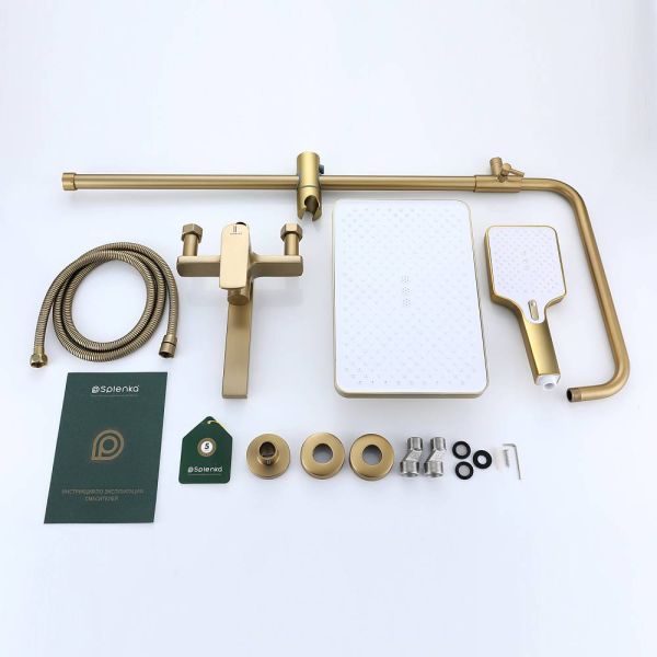 Душевая система Splenka S30.24.03, сатин золотой. Душевая система подходит для ванны и душа. Излив у системы имеет функцию переключения режима подачи воды. Верхний душ имеет прямоугольную форму размером 32 на 21 см. Ручная лейка у системы 3-х режимная. Лейки изготовлены из авс-пластика.