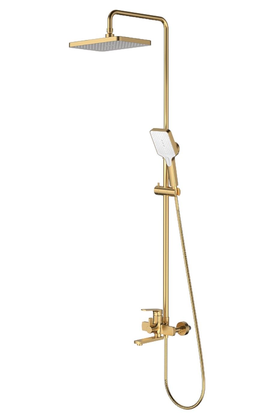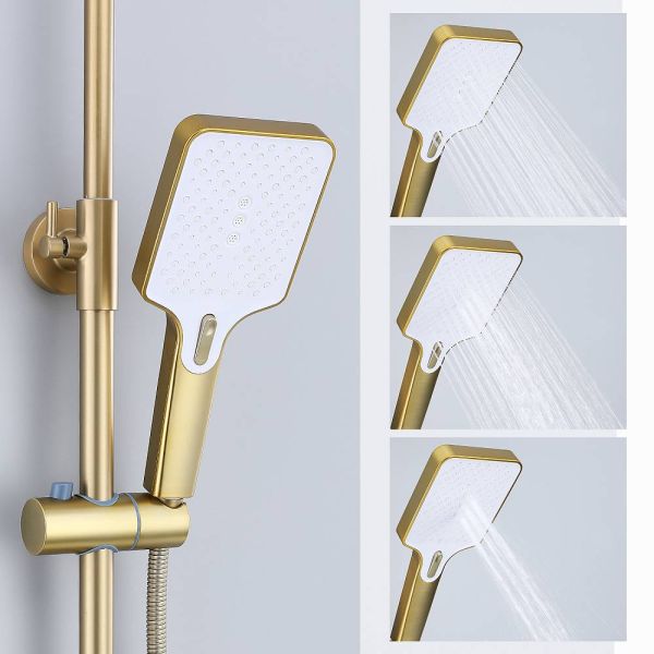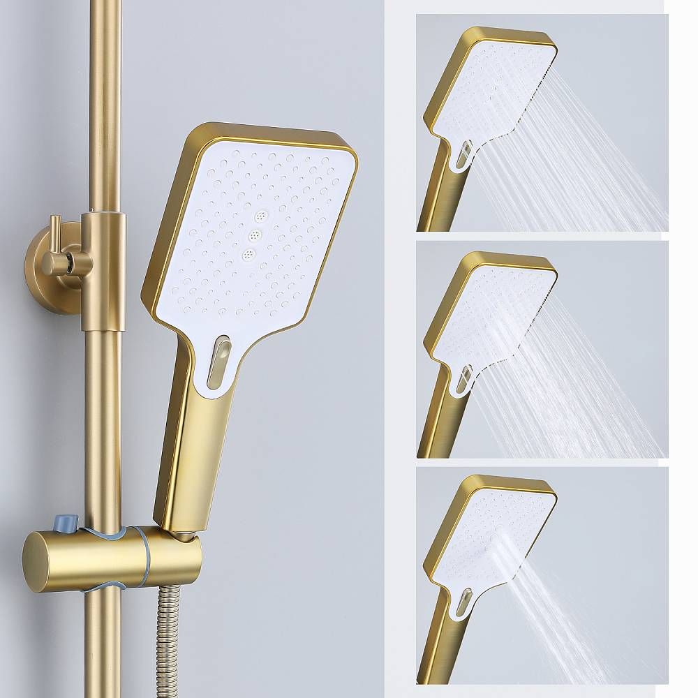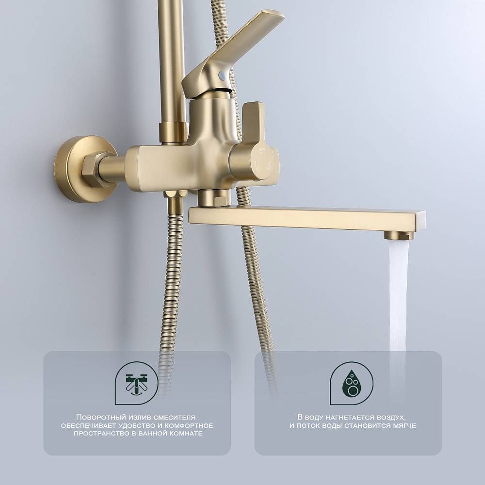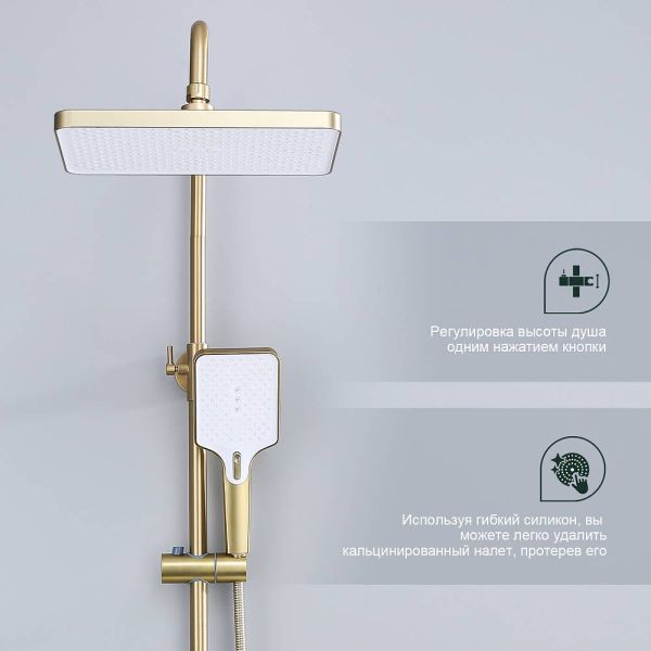 Душевая система Splenka S30.24.03, сатин золотой. Душевая система подходит для ванны и душа. Излив у системы имеет функцию переключения режима подачи воды. Верхний душ имеет прямоугольную форму размером 32 на 21 см. Ручная лейка у системы 3-х режимная. Лейки изготовлены из авс-пластика.