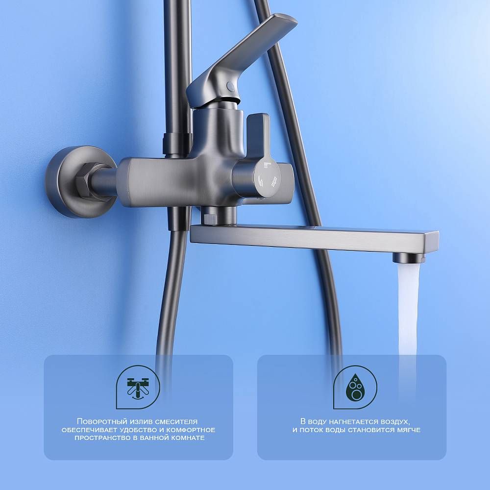 Душевая система Splenka S30.24.09, черный. Душевая система подходит для ванны и душа. Излив у системы имеет функцию переключения режима подачи воды. Верхний душ имеет прямоугольную форму размером 32 на 21 см. Ручная лейка у системы 3-х режимная. Лейки изготовлены из авс-пластика.