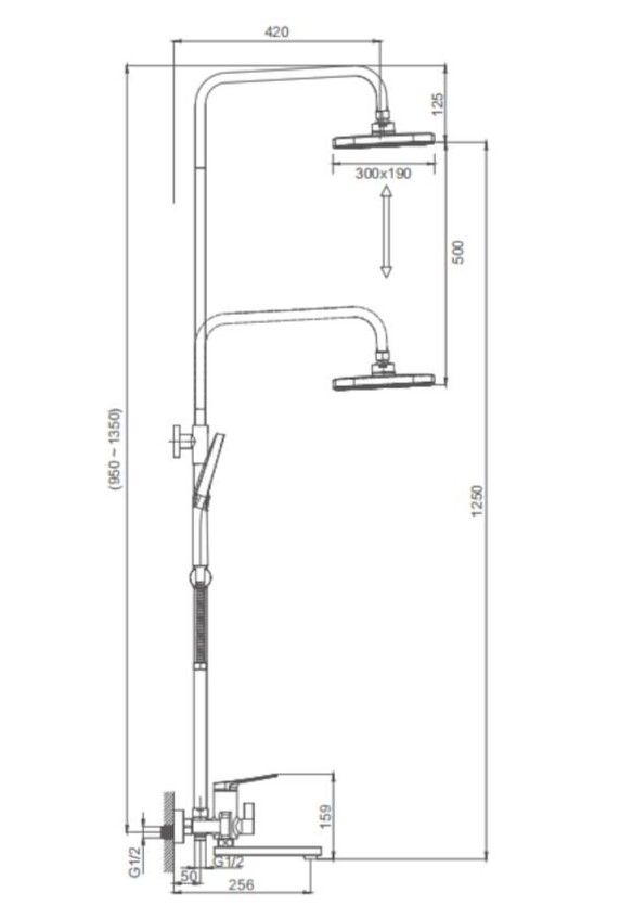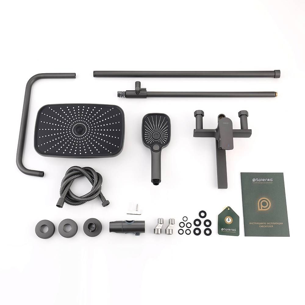 Душевая система Splenka S40.24.07. Цвет: серый. Материал: латунь. Управление: однорычажное. Механизм: керамический картридж. Излив: поворотный. Аэратор. Стандарт подводки: G 1/2. Форма верхнего душа: прямоугольная. Размер верхнего душа (ШхД): 300х190 мм. Количество режимов струи ручного душа: 3. Переключение режимов ручного душа: кнопочное. Регулируемая по высоте душевая штанга: 950-1350 мм. Регулируемый по высоте держатель ручного душа. Монтаж: на стену.