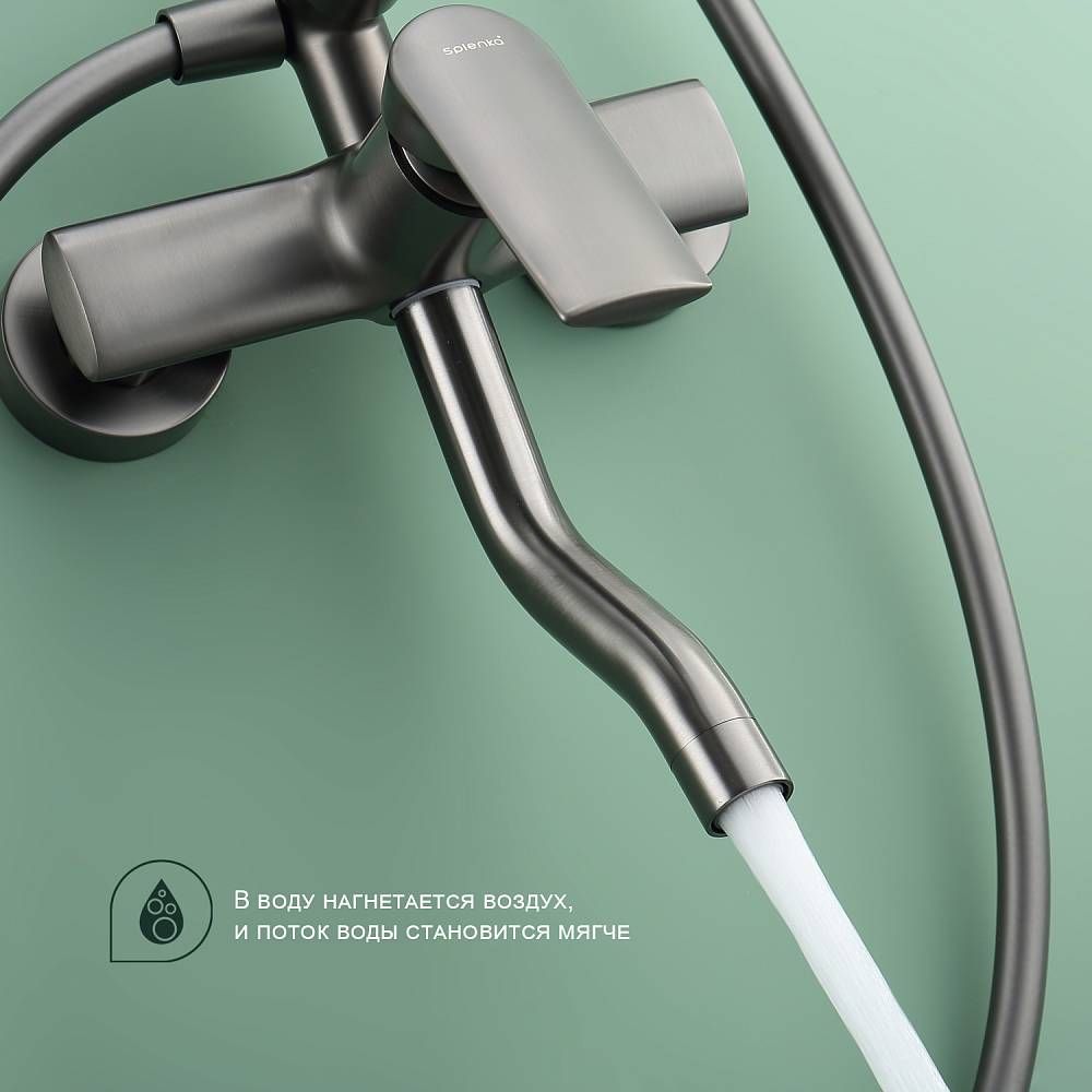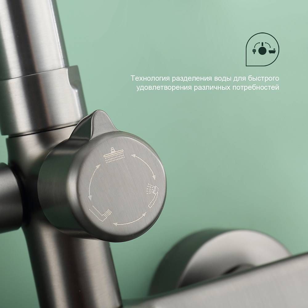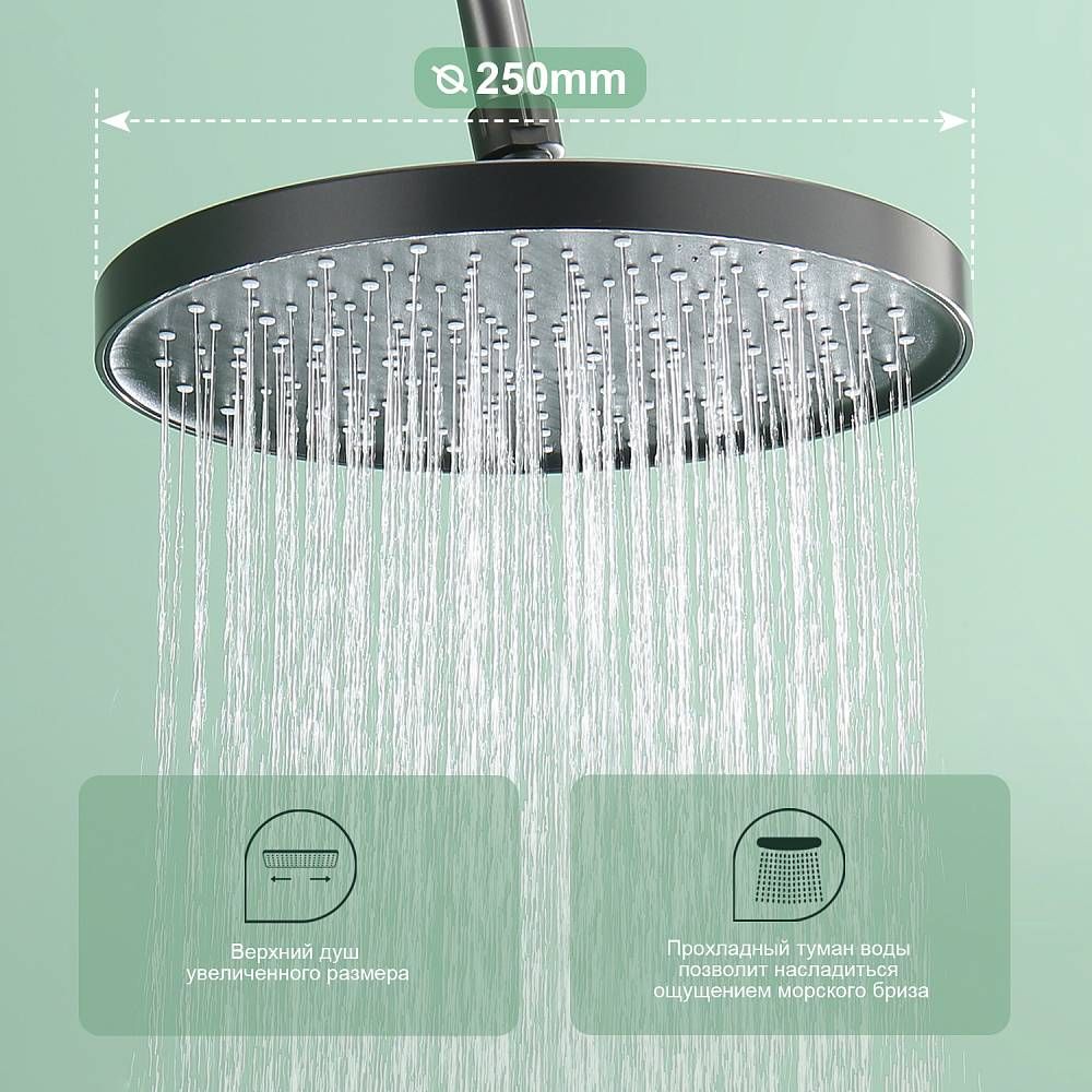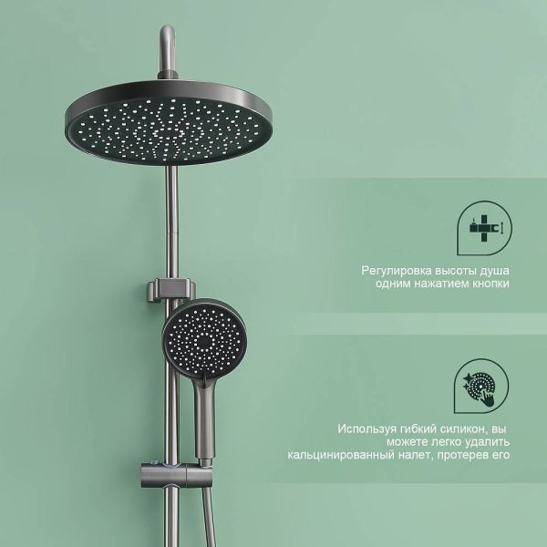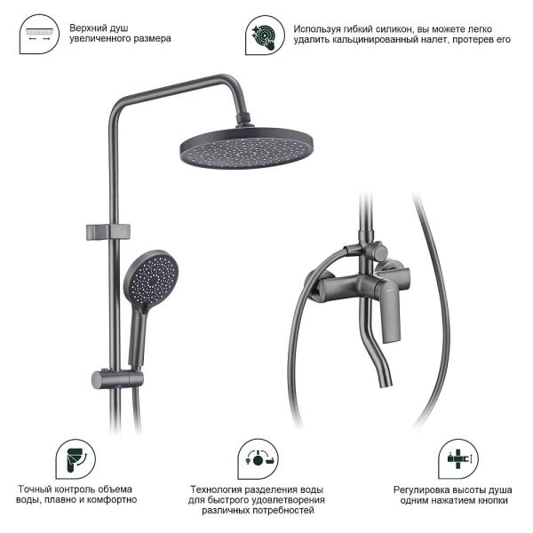 Душевая система Splenka S50.24.09, графит. Душевая система подходит для ванны и душа. Верхний душ имеет круглую форму размером 25 см. Ручная лейка у системы 3-х режимная. Лейки изготовлены из авс-пластика.
