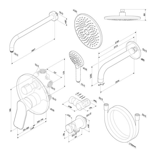 Набор включает в себя: верхний тропический душ 22 см, ручной душ, держатель ручного душа, излив и смеситель.