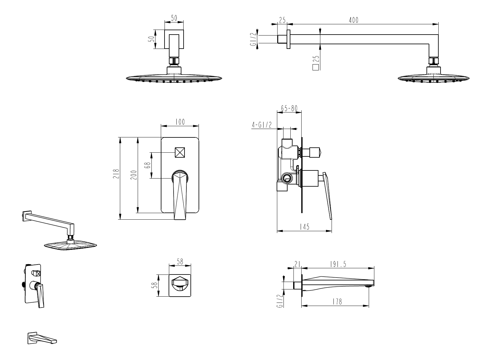 Комплектация: излив, смеситель, верхний душ, ручной душ.