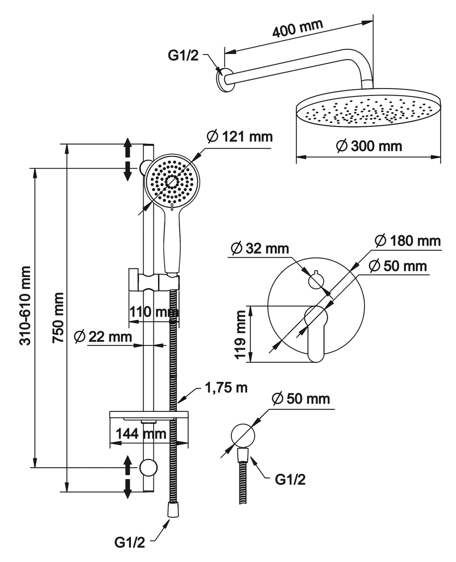 - верхний душ (душевая головка) с регулировкой наклона, настенный монтаж;