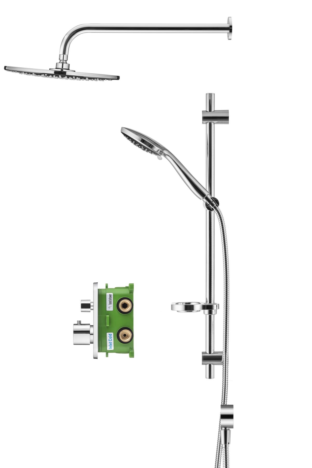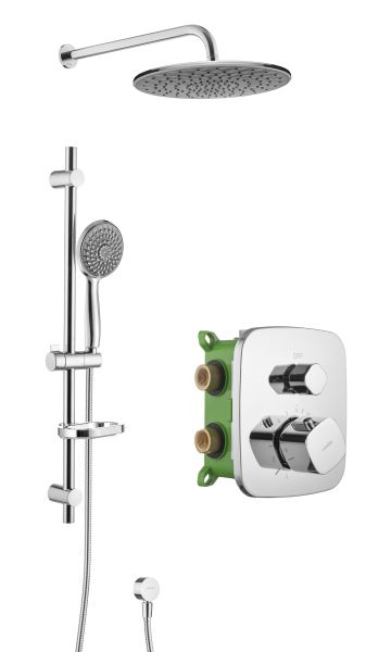 Душевой комплект со встраиваемым термостатическим смесителем на 2 выхода (в монтажном боксе), верхним душем ø300 мм и лейкой ø121 мм (3 режима). Цвет: хром, серый