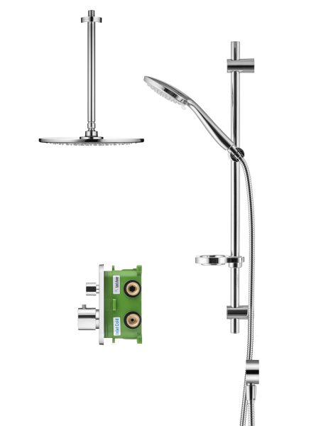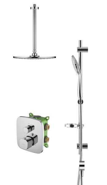 Душевой комплект со встраиваемым термостатическим смесителем на 2 выхода (в монтажном боксе), верхним душем ø300 мм и лейкой ø121 мм (3 режима)