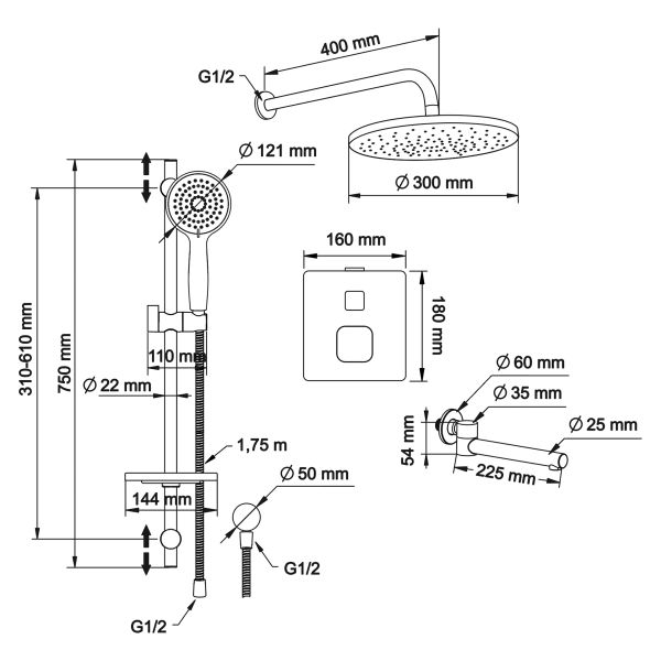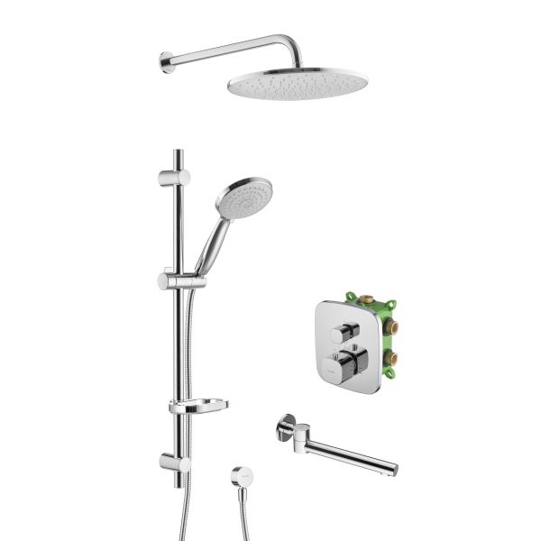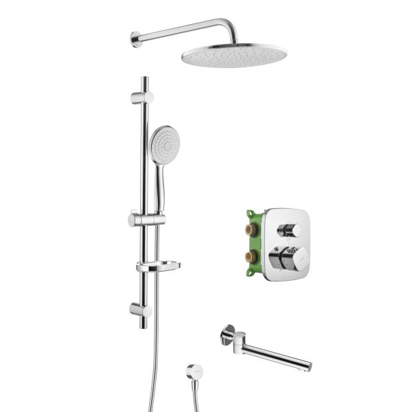 Душевой комплект со встраиваемым термостатическим смесителем на 3 выхода (в монтажном боксе), верхним душем ø300 мм, лейкой ø121 мм (3 режима) и поворотным изливом