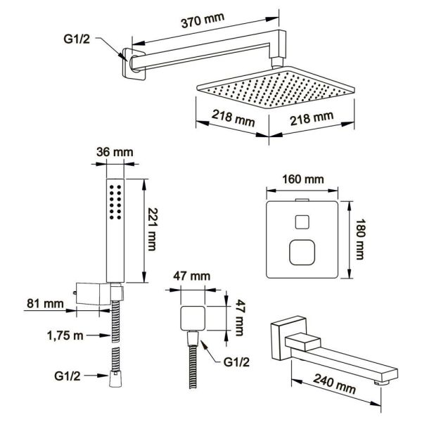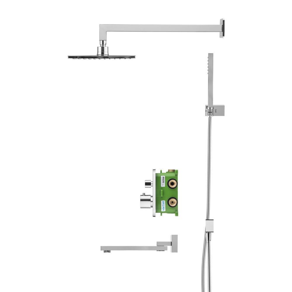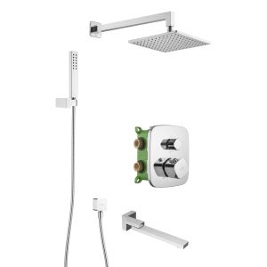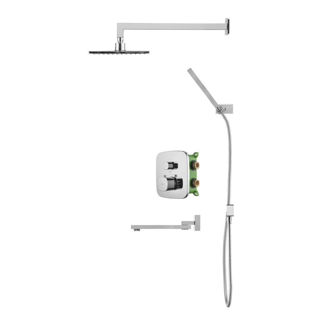 Душевой комплект со встраиваемым термостатическим смесителем на 3 выхода (в монтажном боксе), верхним душем 218х218 мм, лейкой 36х221 мм (1 режим) и поворотным изливом