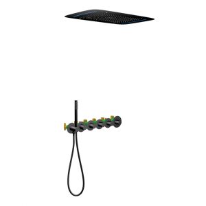 Черная сантехника становится все более популярной для ванных комнат из-за способности расставлять акценты.Встраиваемая душевая система с термостатом Timo Saona 2319 относится к премиальному сегменту, предназначена для монтажа в полой или твердой стене. Термостатический картридж поддерживает стабильную температуру воды, обеспечивая максимально комфортные условия для принятия водных процедур. Встроенный потолочный душ большого размера создает имитацию проливного дождя, вода обливает человека целиком. Регулируя напор воды можно получить массажное воздействие, что очень полезно для здоровья. Основные преимущества встроенной системы: элегантный внешний вид, все коммуникации и крепления спрятаны в стену и потолок, снаружи видны только декоративные элементы. Установить встроенную систему можно в любом месте. Сложностей монтажа не возникает при установке элементов душевой системы опытным сантехником. Внимательно изучите инструкцию по монтажу и эксплуатации.Черная сантехника требует бережного ухода.